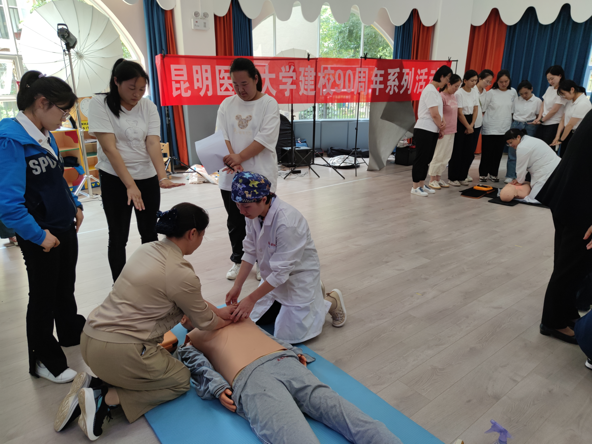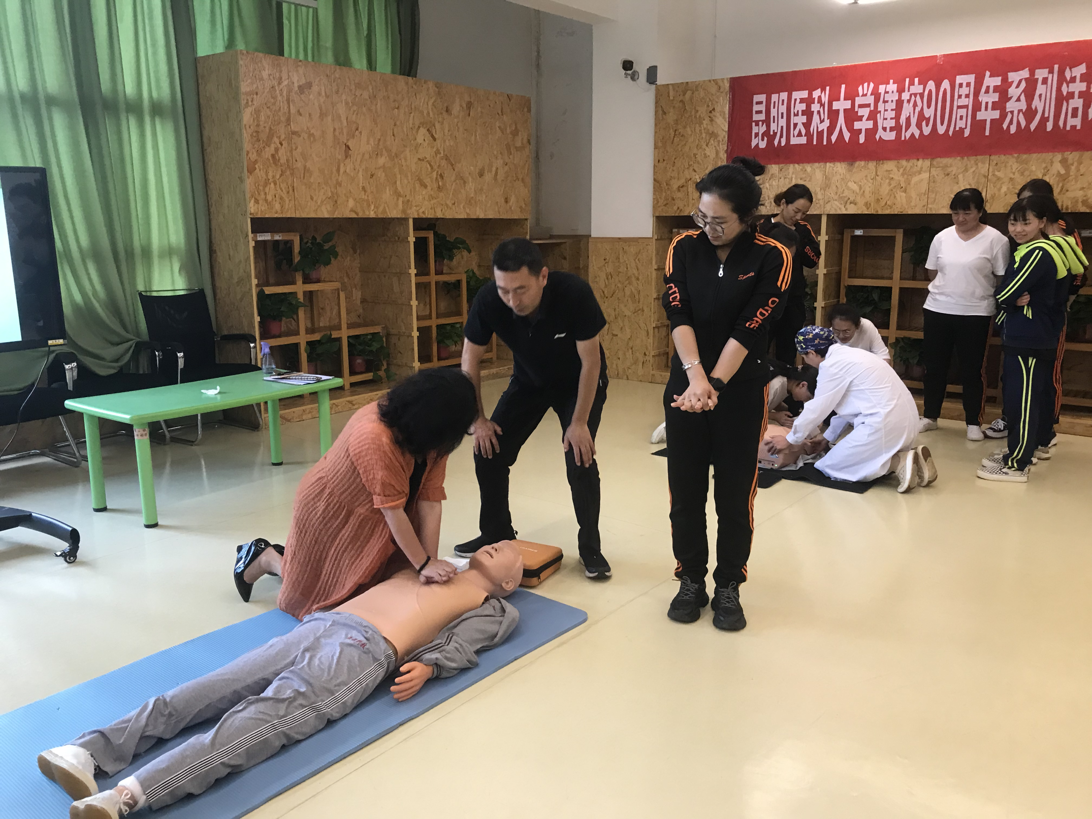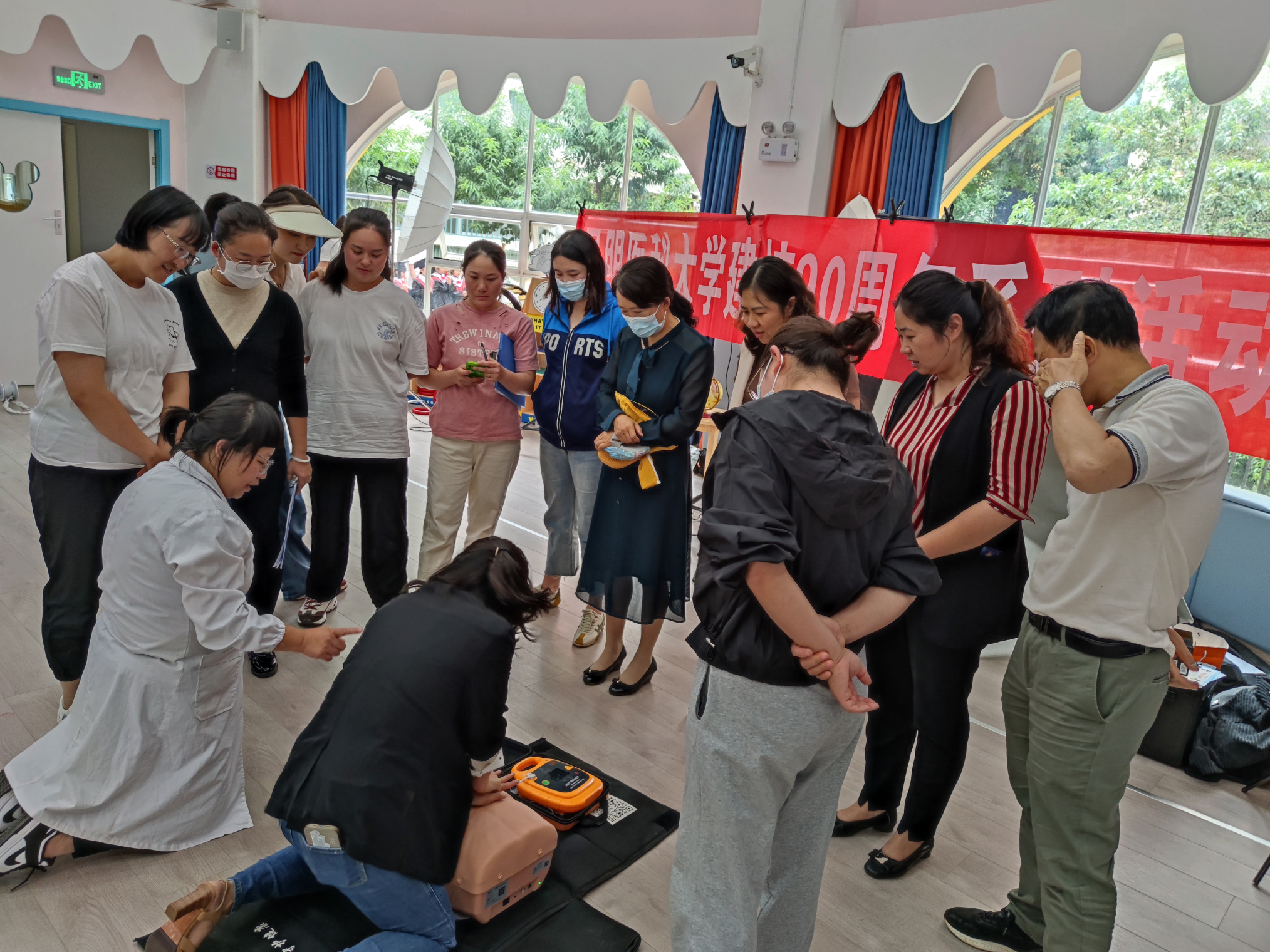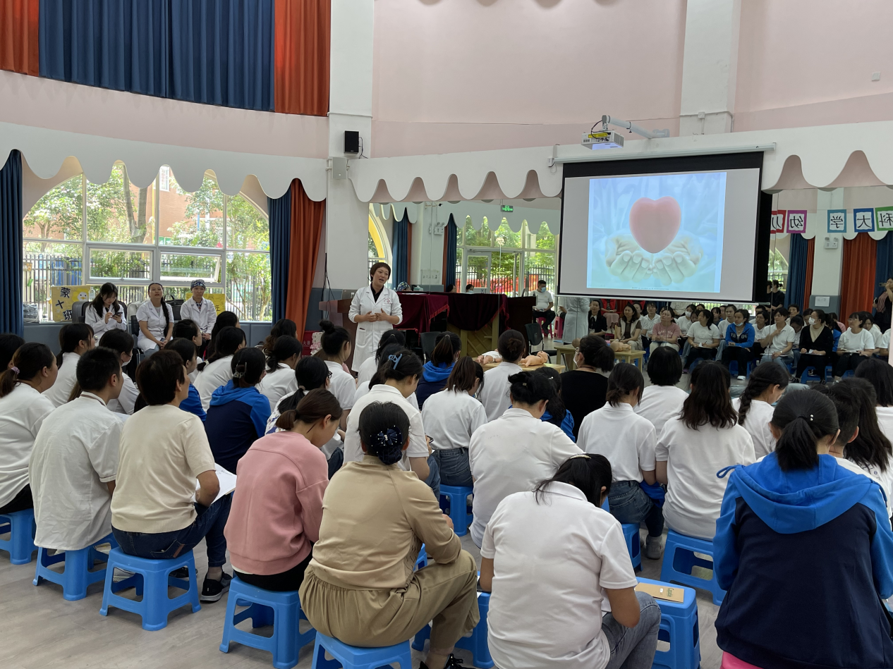 值此学校建校九十周年之际,为体现学校办学特色和社会服务理念,响应学校的号召,为母校九十周年华诞献礼,临床技能中心筹划了“建校90周年”系列活动,6月主题为“人人学急救,急救为人人”科普培训活动,6月26日、27日在后勤发展中心大力支持下,由临床技能中心党支部牵头、党外知识分子参与,到beat365中文官方网站幼儿园天润康园、吾悦花园两个园区为幼儿园教职工开展了急救知识培训活动,旨在提高幼儿园教师急救意识和互救能力。