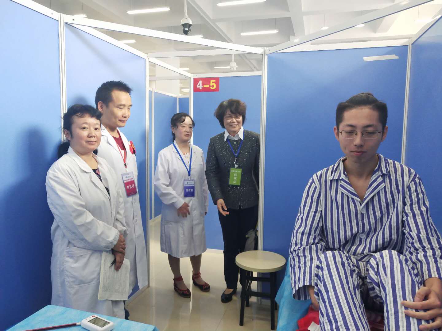 按照考试设置,本次考试共开设8个考组,每组6个考站,同批推进。要求考生在1个小时内完成病史采集、体格检查和临床基本技能的操作,中心共派出考官、SP及考务人员共356人参与考试工作。
