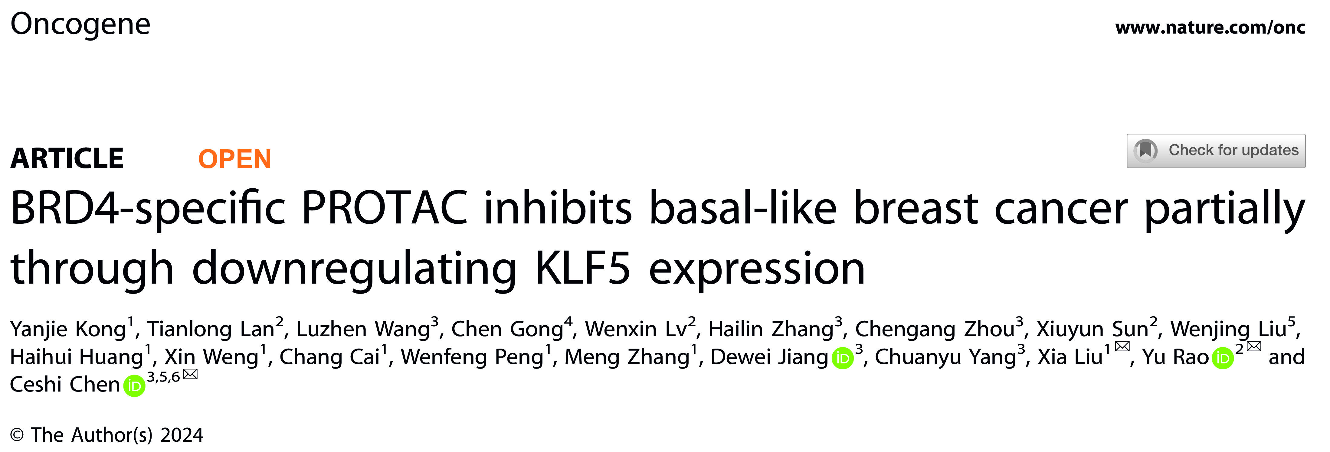 最近,beat365中文官方网站生物医学工程研究院、beat365中文官方网站第三附属医院陈策实院长团队与清华大学药学院饶燏教授团队合作,在国际癌症研究领域的《Oncogene》杂志发表题为“BRD4-speci?c PROTAC inhibits basal-like breast cancer partially through downregulating KLF5 expression”的研究论文。