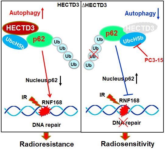 放射治疗主要通过损伤DNA杀死肿瘤细胞,产生抵抗的肿瘤细胞表现出更强的DNA损伤修复能力,而自噬可以促进DNA损伤修复。我们的研究发现,E3泛素连接酶 HECTD3通过泛素化p62增强自噬,减少p62在细胞核中的积累,促进RNF168介导的DNA损伤修复,从而帮助癌细胞抵抗辐照诱导的损伤。科研团队进一步筛选到一个来源于中药五味子的三萜化合物PC3-15能够抑制UbcH5b-HECTD3共同介导的p62泛素化修饰,抑制DNA损伤修复,增加三阴性乳腺癌的放疗敏感性。