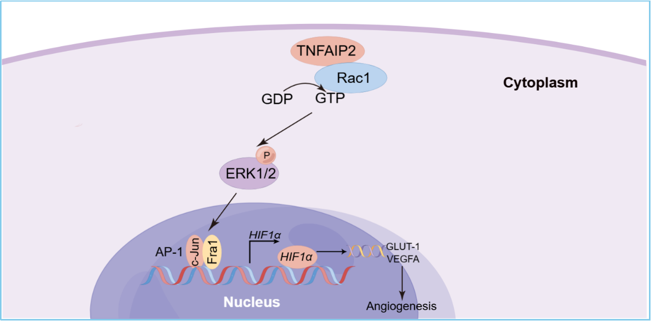 2024年11月13日,以上研究成果以TNFAIP2 promotes HIF1α transcription and breast cancer angiogenesis by activating the Rac1-ERK-AP1 signaling axis为题,在线发表于《Cell Death & Disease》。