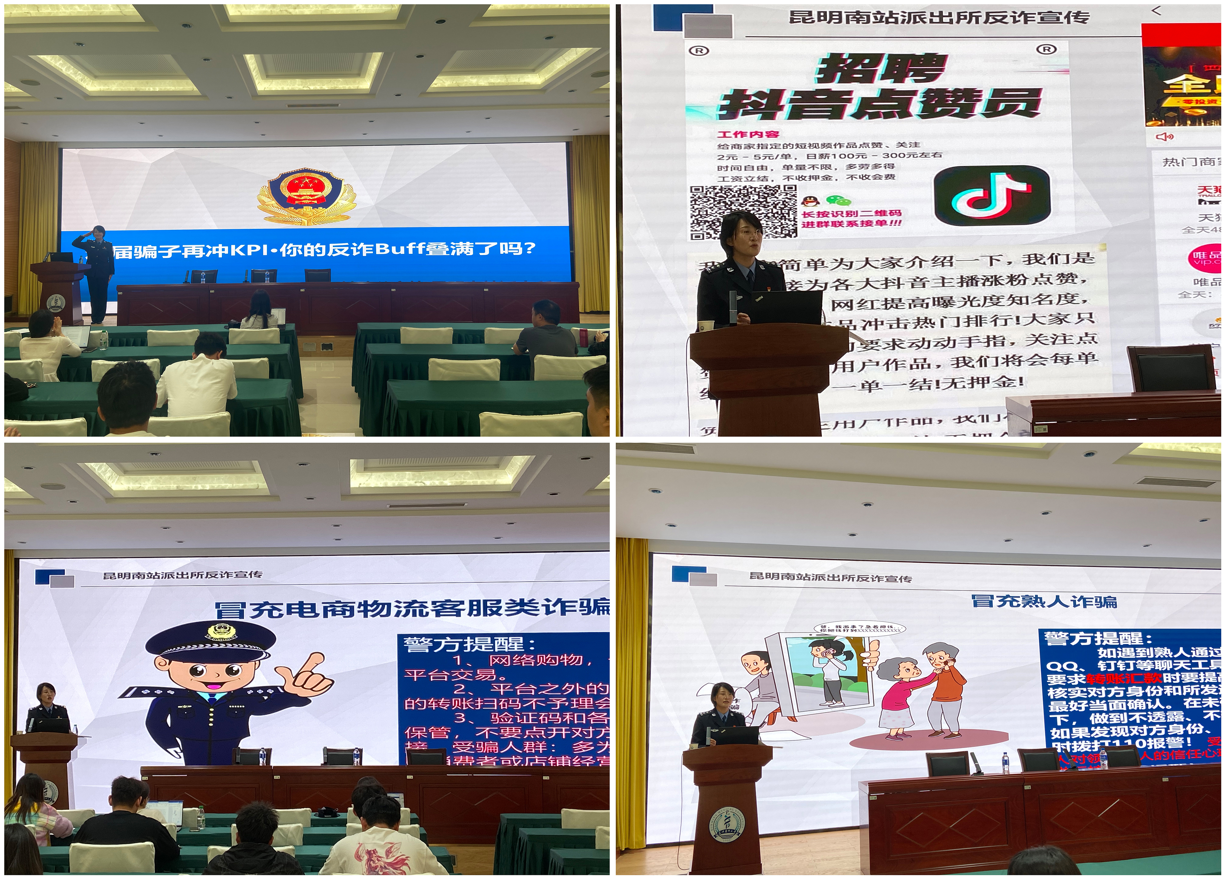 在防范电信网络诈骗专题讲座中,史珂维队长以《这届骗子再冲KPI,你的反诈Buff叠满了吗?》为题,深入剖析了当前社会上高发的各类网络诈骗手段,结合近期高发案例,系统梳理了刷单返利、冒充客服、虚假贷款、冒充公检法、网络婚恋交友、虚假购物、游戏装备交易等多种诈骗类型的常见手法与防范要点。她强调,诈骗分子常利用受害人贪利、恐慌、轻信心理,通过伪造身份、钓鱼网站、假冒官方电话、AI换脸等新技术实施诈骗。史队长提醒大家保护好个人信息,不随意透露身份证、银行卡、验证码等敏感信息;遇到涉及资金转账、银行卡操作、中奖、补贴、紧急求助等情况务必核实对方身份,切勿轻信陌生来电和短信链接,如遇可疑情况及时报警或通过官方渠道核实。