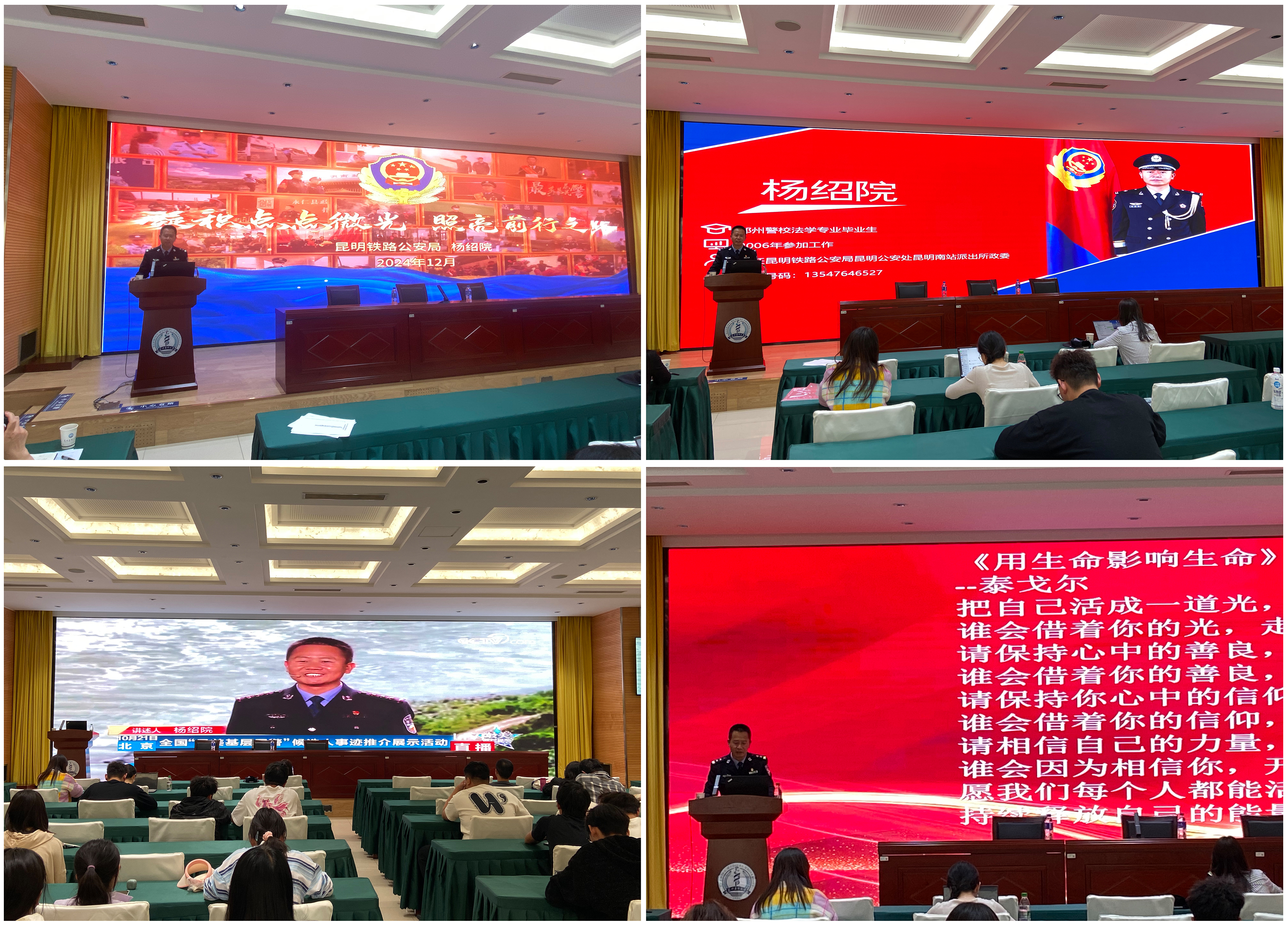 杨绍院政委则以《凝聚点点微光,照亮前行之路》为题,分享了自己从云南保山施甸县农村走出来、坚守铁路公安一线的感人事迹。杨绍院以老家僻远村寨里叔伯兄弟中学毕业后都前往沿海发达地区打工,自己也利用假期在建筑工地打工的亲身经历,道出生活艰难,后发奋励志考入警校,毕业后服从组织工作安排,扎根基层偏远一线。工作中,他始终以人民利益为重,13年如一日,兢兢业业,确保了铁路运输大动脉的安全畅通,同时践行“新时期枫桥经验”积极融入群众、服务基层,提升了辖区沿线百姓的护路防伤意识,确保了辖区老百姓的生命财产安全,取得了良好的工作业绩。杨绍院不仅用心守护辖区安全,还积极帮助山区贫困学生,悉心资助,助力他们完成学业。同时他带领团队整合资源,用4年多时间封堵开放铁路线路,做到了辖区铁路交通事故的零发生,切实保护了辖区人民群众生命财产的安全。因工作成绩突出,杨绍院被中宣部和公安部授予2019年首届“最美基层民警”称号,并被授予公安部“二级英雄模范”称号,获评云南省第十届“百姓最喜爱的人民警察”,并被记个人一等功一次,成为全国公安系统的先进典型。他的事迹被多家中央媒体广泛宣传,成为新时代人民警察忠诚履职、为民奉献的榜样。