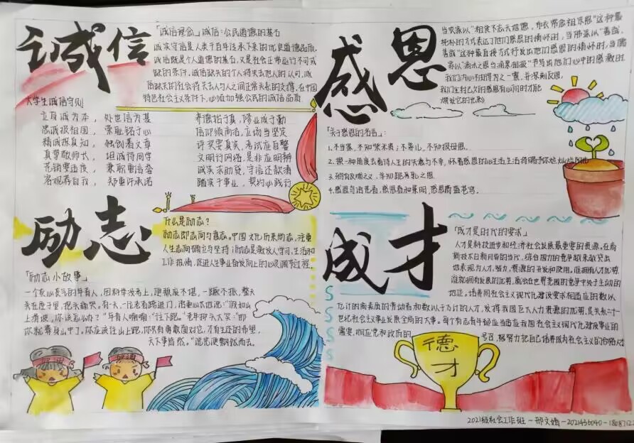 组织开展了以“诚信感恩,励志成才”为主题的手抄报征集大赛。广大学生紧紧围绕诚信教育主题,从寓言故事引述诚信的重要性;从名言名句阐述坚守诚信的意义;从自身感悟谈如何做到诚信,启发同学们进一步思考如何在学习、生活中树立诚信意识。
