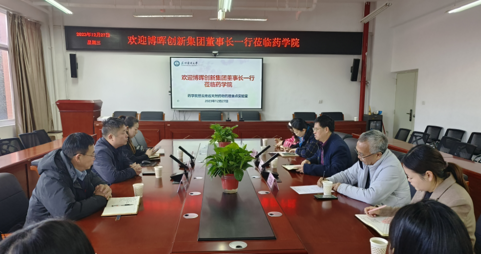 12月27日上午,博晖创新生物技术(云南)有限公司董事长沈治卫一行3人来访beat365中文官方网站药学院洽谈校企合作共建事宜。会议在药学楼204会议室举行,药学院党委书记张有福、副院长陆露、党政办副主任郝静超、社会服务部主任刘光、学生工作办公室主任罗梅、教学办公室副主任李霁等参加。