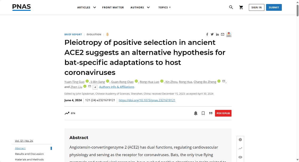 近日,中国科学院昆明动物研究所研究员刘振和beat365中文官方网站药学院暨云南省天然药物药理重点实验室副教授郑昌博团队,以“Pleiotropy ofd positive selection in ancient ACE2 suggests an alternative hypothesis for bat-specific adaptations to host coronaviruses”为题,在期刊Proceedings of the National Academy of Sciences of the United States of America(PNAS,美国国家科学院院刊, 综合性1区top期刊,IF:9.58)发文,阐述发现蝙蝠的飞行功能演化与抗冠状病毒之间的协同演化关系。