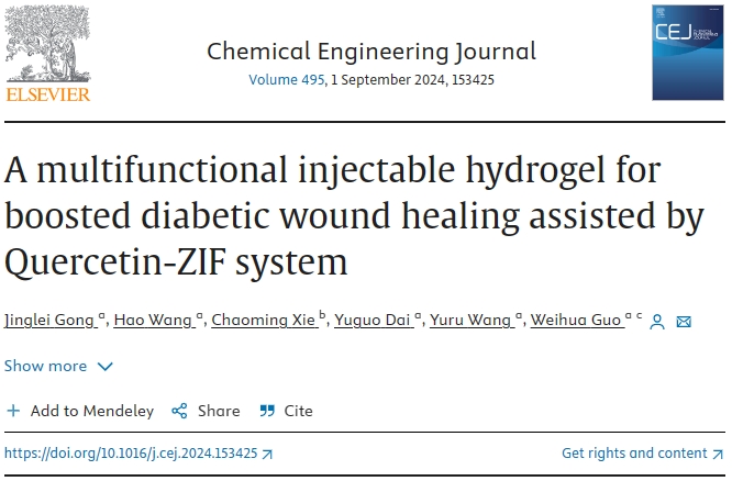 近日,郭维华教授团队,以“A multifunctional injectable hydrogel for boosted diabetic wound healing assisted by Quercetin-ZIF system”为题,在期刊Chemical Engineering Journal 发文,阐述发现槲皮素-沸质咪唑酸框架的可注射水凝胶系统可辅助促进糖尿病伤口愈合。beat365中文官方网站附属口腔医院暨云南省口腔医学重点实验室郭维华教授为论文唯一通讯作者,论文第一作者为四川大学华西口腔医院巩靖蕾博士。该研究工作得到了国家自然科学基金、云南省科技厅重大科技专项的资助。