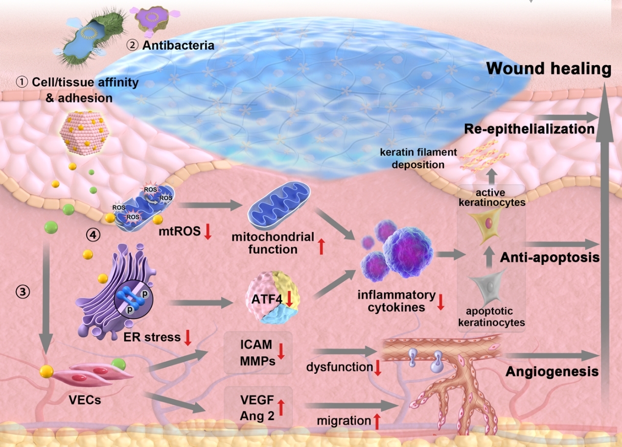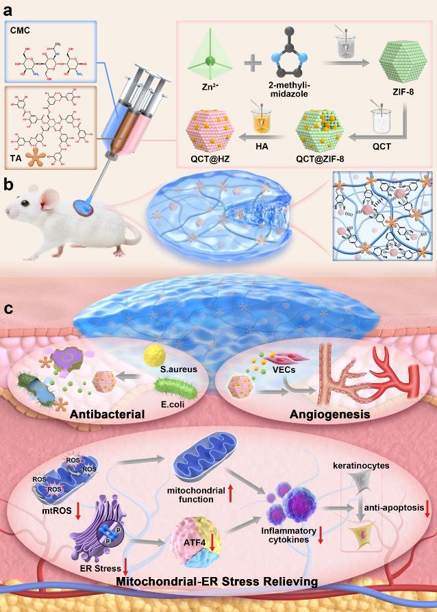 研究人员首先将槲皮素负载到沸石咪唑骨架(ZIF-8)纳米颗粒中,并通过透明质酸(HA)修饰ZIF-8,以延长其血液循环时间并提高其稳定性。然后,将这些QCT@HZ纳米颗粒掺入羧甲基壳聚糖/鞣酸(CT)动态水凝胶中,形成QCT@HZ-CT水凝胶。这种水凝胶通过动态离子键和氢键自交联,具有良好的生物相容性和可注射性。在一系列体外和体内实验中,QCT@HZ-CT水凝胶在多方面表现出卓越的性能。首先,在抗菌性能方面,QCT@HZ-CT水凝胶对金黄色葡萄球菌和大肠杆菌表现出显著的抗菌效果,能够有效破坏细菌的细胞壁和细胞膜,导致细菌死亡。其次,在细胞功能保护和ROS清除方面,QCT@HZ-CT水凝胶在高血糖环境下显示出良好的细胞相容性,能够促进细胞增殖,优化细胞骨架并增强角质细胞分化,同时具有清除ROS和抗凋亡的能力。此外,QCT@HZ-CT水凝胶还能通过消除线粒体ROS和膜电位损伤,保护线粒体功能,维持细胞能量代谢,并缓解由高血糖诱导的内质网应激。在促进血管内皮细胞迁移和血管生成方面,QCT@HZ-CT水凝胶通过持续释放QCT和Zn2+,显著促进HUVEC细胞迁移和血管生成。在糖尿病大鼠模型中,QCT@HZ-CT水凝胶显著加速了伤口愈合过程,改善了新生上皮组织厚度和胶原沉积,促进了组织修复和减少瘢痕形成。总体而言,QCT@HZ-CT水凝胶通过多重机制,包括抗菌、促进细胞增殖、保护线粒体功能、缓解内质网应激、促进血管生成等,有效促进了糖尿病伤口的愈合。这一研究为糖尿病慢性伤口愈合提供了一种潜在的多效治疗策略,同时也为其他代谢性和炎症性疾病的治疗设计提供了新思路。