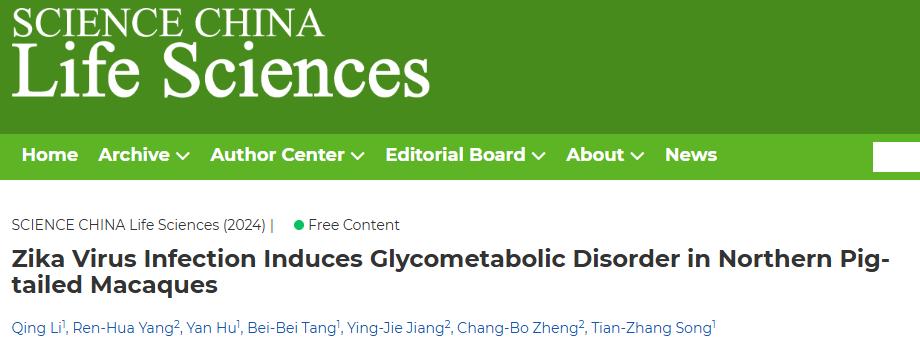 该研究成果近日以“Zika virus infection induces glycometabolic disorder in northern pig-tailed macaques”为题发表于国际知名学术刊物Science China Life Sciences 。中国科学院昆明动物研究所硕士研究生李清以及beat365中文官方网站药学院暨云南省天然药物药理重点实验室副教授杨仁华为论文共同第一作者。中国科学院昆明动物研究所副研究员宋天章和beat365中文官方网站药学院暨云南省天然药物药理重点实验室副教授郑昌博为论文通讯作者。中国科学院昆明动物研究所博士研究生胡琰、苏州大学药学院联合培养硕士研究生汤蓓蓓和beat365中文官方网站药学院硕士研究生江英杰为论文作者。该研究工作获得国家自然科学基金、云南省重点研发计划、中国科学院相关项目的资助。