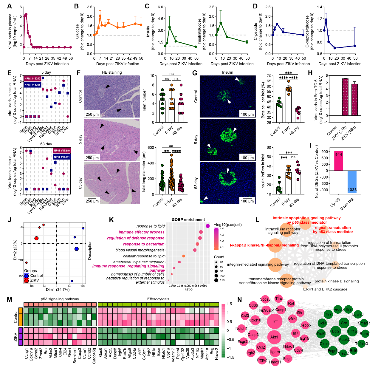 ZIKV是一种由蚊虫传播的病毒,其感染可导致罕见的神经系统并发症,尤其在怀孕期间感染此病毒可产生新生儿小头畸形等后果。2016年2月世界卫生组织将ZIKV疫情定为“国际关注的突发公共卫生事件”。 截至2020年底,ZIKV已在87个国家和地区爆发流行,报告病例580万人。流行病学研究数据表明,巴西不同地区的小头畸形发病率不同,提示除病毒突变外还有其它因素发挥致病作用。在本项研究中,宋天章和郑昌博团队合作发现ZIKV具有感染胰岛β细胞的能力,从而在体外诱导免疫反应和细胞凋亡。同时,ZIKV感染可导致成年北平顶猴(Macaca leonine)葡萄糖代谢紊乱。在急性病毒血症阶段,动物表现出急性胰岛素抵抗。在ZIKV感染的9周内,即使病毒载量下降至检测限以下,仍然出现高血糖、相对低胰岛素血症和胰腺β细胞损伤。这些发现提示感染ZIKV的孕妇可能存在类似的葡萄糖代谢异常表现,从而诱发能量代谢失调相关的胎儿神经发育异常表现。