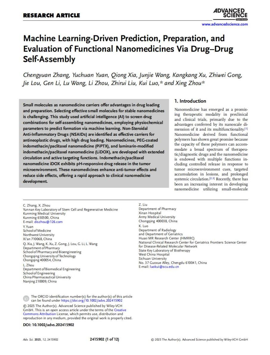 C.Zhang,Y.Yuan,Q.Xia,J.Wang,K.Xu,Z.Gong,J.Lou,G.Li,L.Wang,L.Zhou,Z.Liu,K.Luo,X.Zhou,Machine Learning-Driven Prediction,Preparation,and Evaluation of Functional Nanomedicines Via Drug–Drug Self-Assembly.Adv.Sci.2025,12,2415902.