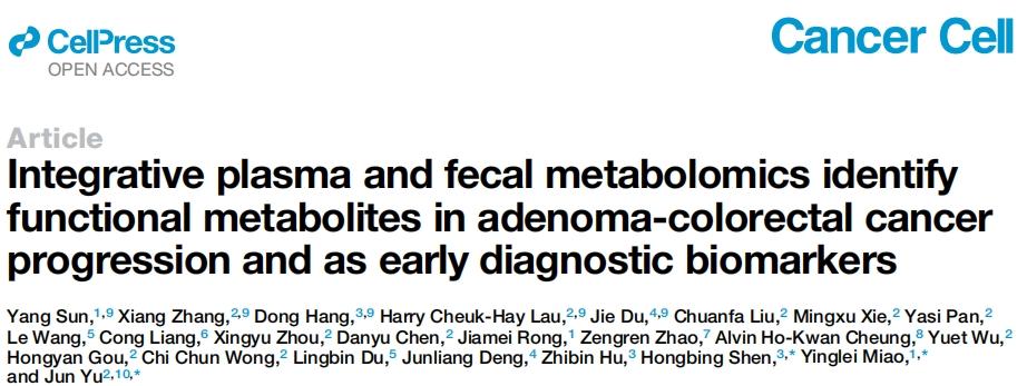 近日,beat365中文官方网站第一附属医院孙杨、缪应雷教授团队联合香港中文大学于君教授团队、南京医科大学沈洪兵院士团队、上海百趣代谢组学技术研究中心杜杰研究员团队,以学校为第一单位在国际顶级期刊《Cancer Cell》(IF=48.8)上发表了题为《Integrative plasma and fecal metabolomics identify functional metabolites in adenoma-colorectal cancer progression and as early diagnostic biomarkers》的论文,并被选为该期封面文章。实现学校在三大科技期刊(Cell、Nature、Science)之一Cell的大子刊上发表重要研究成果的再次突破,标志着学校在科技创新赋能高质量发展方面取得新成效。