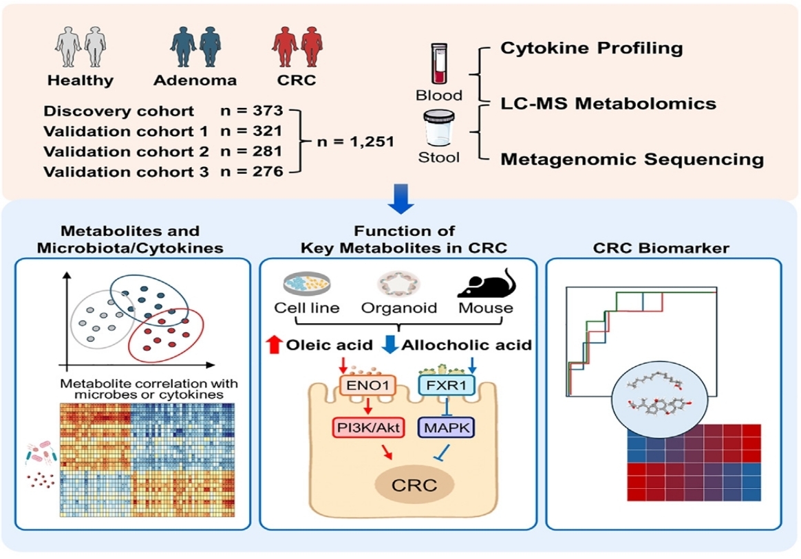 本研究探索了大规模队列中CRC进展中的代谢组学特征,及代谢物在CRC进展中的功能意义。本研究收集了来自4个独立队列的1251人的血液和粪便样本(CRC 422例、CRA 399例和健康受试者(NC)430例),包括来自发现队列的373份粪便和血浆样本,以及来自三个独立验证队列的878份血浆样本。通过代谢组学分析,确定了与NC相比、CRA和CRC的血浆代谢组均存在显著差异,且NC、CRA和CRC中存在差异的血浆代谢物变化具有一致性,特别是沿着腺瘤—癌变过程中的油酸富集和别胆酸消耗。油酸和别胆酸是结直肠癌进展的关键代谢物。油酸与CRC细胞中的ENO1受体结合,进而激活了致癌的PI3K/Akt信号通路促进肿瘤生长;别胆酸与法尼醇X(FXR1)受体结合,进一步导致了CRC中MAPK信号通路的失活抑制肿瘤的生长。这些关键代谢物的作用通过CRC细胞系、患者来源的类器官和小鼠模型得到证实,并对其潜在机制进行了后续研究。