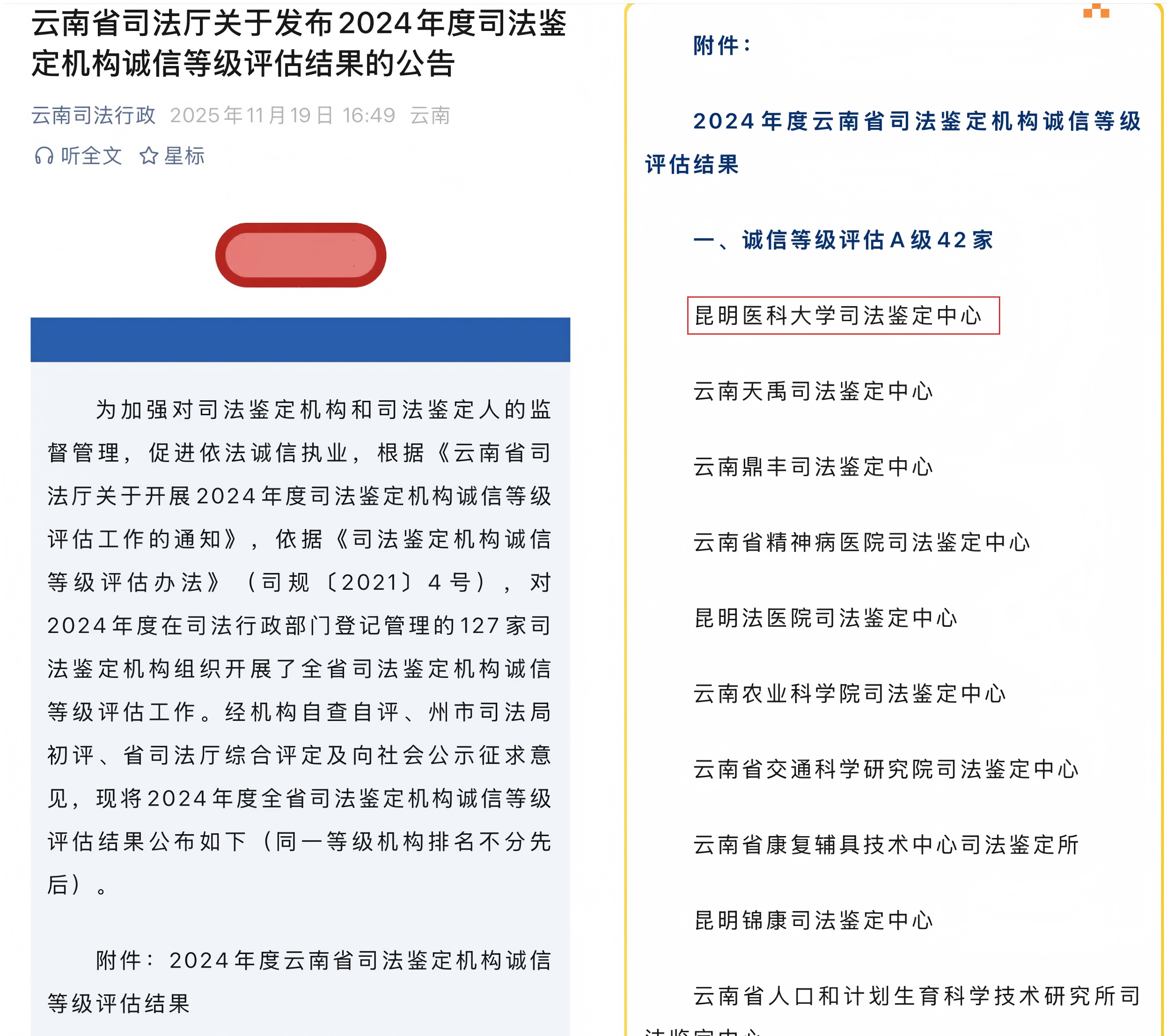 近日,云南省司法厅发布了《关于2024年度司法鉴定机构诚信等级评估结果的公告》,beat365中文官方网站司法鉴定中心获评A级。