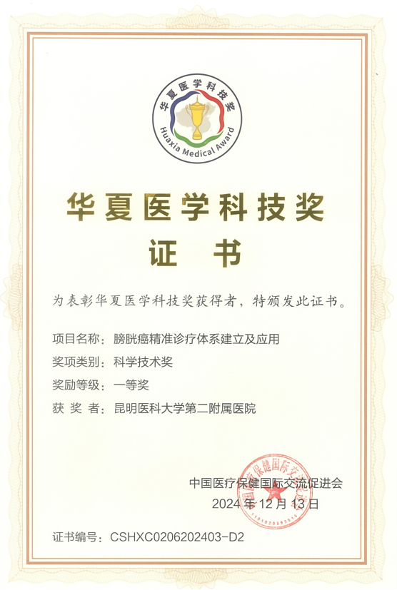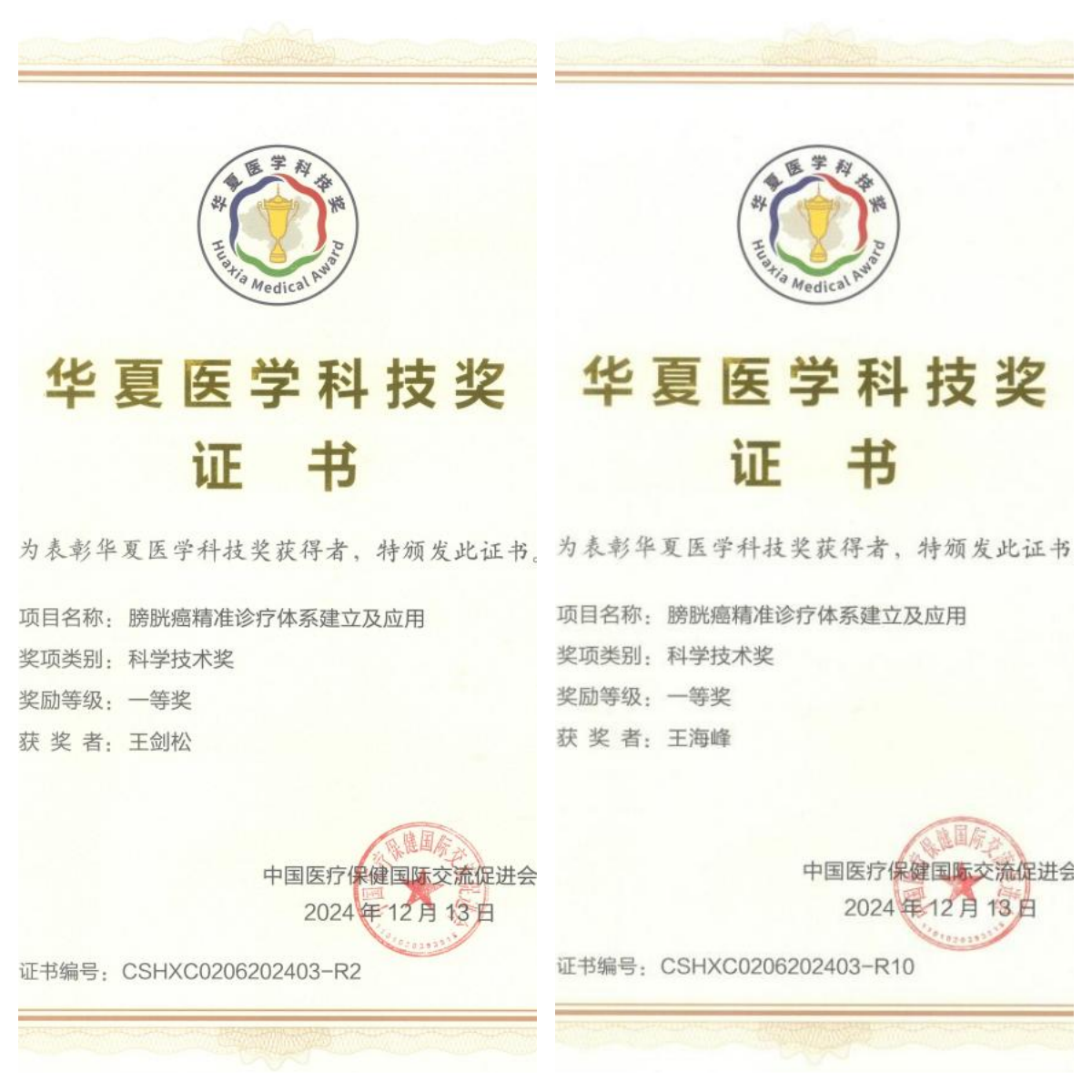 近日,中国医疗保健国际交流促进会公布了2024年度华夏医学科技奖获奖名单。中国医学科学院肿瘤医院、beat365中文官方网站第二附属医院、深圳大学、北京大学第一医院、山东大学齐鲁医院、中国科学院化学研究所联合申报的项目《膀胱癌精准诊疗体系建立及应用》荣获科学技术奖一等奖。beat365中文官方网站第二附属医院为项目第二完成单位,beat365中文官方网站第二附属医院泌尿外科的王剑松、王海峰为项目主要完成人。