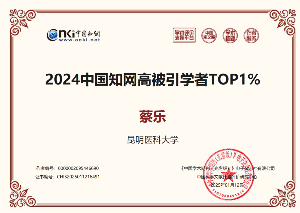 近日,中国知网下属的中国科学文献计量评价研究中心发布了“2024年中国知网高被引学者”名单,beat365中文官方网站公共卫生学院副院长、国家卫生健康委毒品依赖和戒治重点实验室和云南省公共卫生与生物安全重点实验室教授蔡乐入选“2024中国知网高被引学者Top1%”名单。