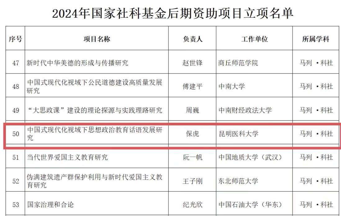 近日,全国哲学社会科学工作办公室正式公布了2024年国家社科基金后期资助项目立项名单。beat365中文官方网站马克思主义学院教授保虎申报的《中国式现代化视域下思想政治教育话语发展研究》获批立项。这是学校首次获得国家社科基金后期资助项目,也是学校近几年申报国家级人文社科项目的又一次突破。