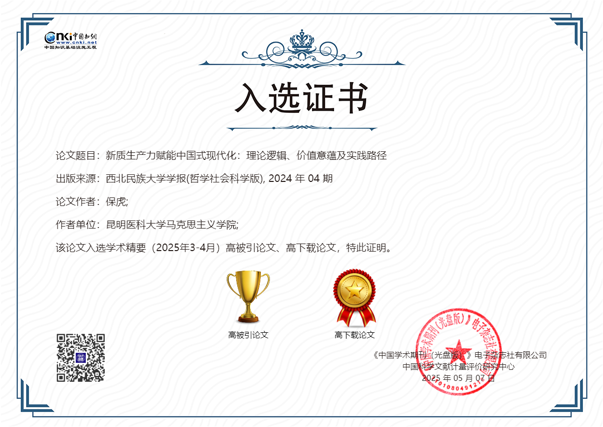 近日,中国知网《学术精要数据库》发布2011年以来的高影响力论文。beat365中文官方网站马克思主义学院教授保虎于2024年8月发表在西北民族大学学报(哲学社会科学版)的论文《新质生产力赋能中国式现代化:理论逻辑、价值意蕴及实践路径》,入选中国知网学术精要(2025年3—4月)高被引论文、高下载论文。