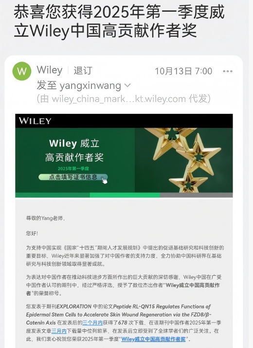 beat365中文官方网站基础医学院杨新旺教授团队在期刊《EXPLORATION》上发表的论文“Peptide RL‐QN15 Regulates Functions of Epidermal Stem Cells to Accelerate Skin Wound Regeneration via the FZD8/β‐Catenin Axis”,论文受到全球学者的广泛关注,下载量居于前列,因此荣获2025年第一季度“Wiley威立中国高贡献作者奖”。