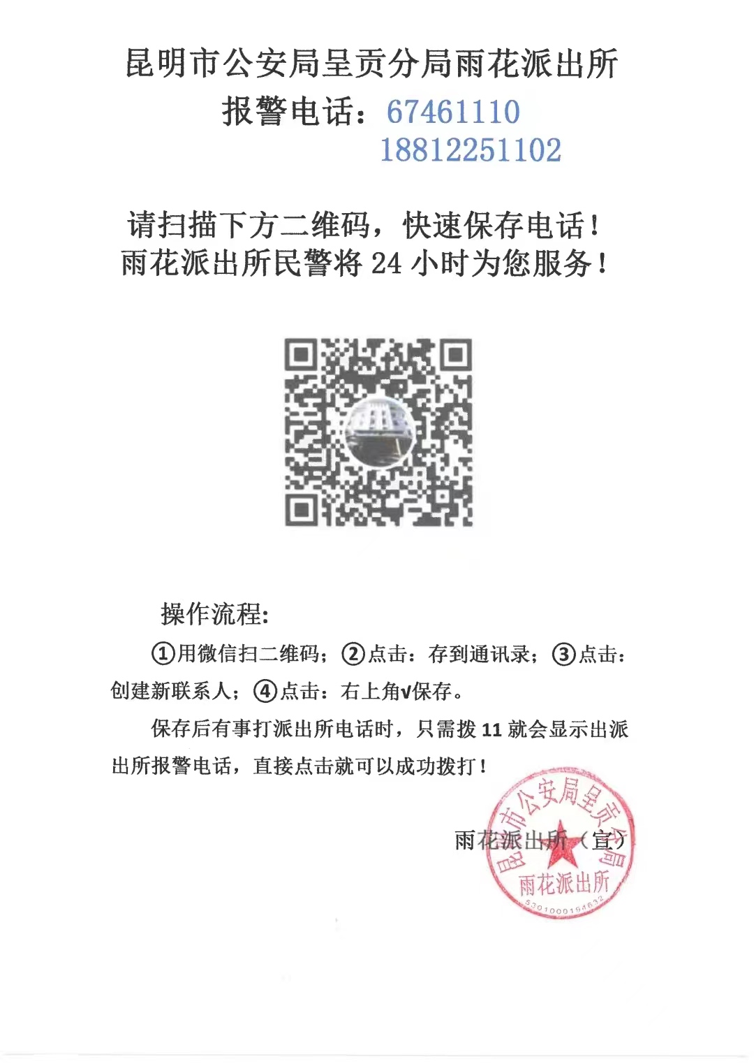 昆明市公安局呈贡分局雨花派出所报警电话公布