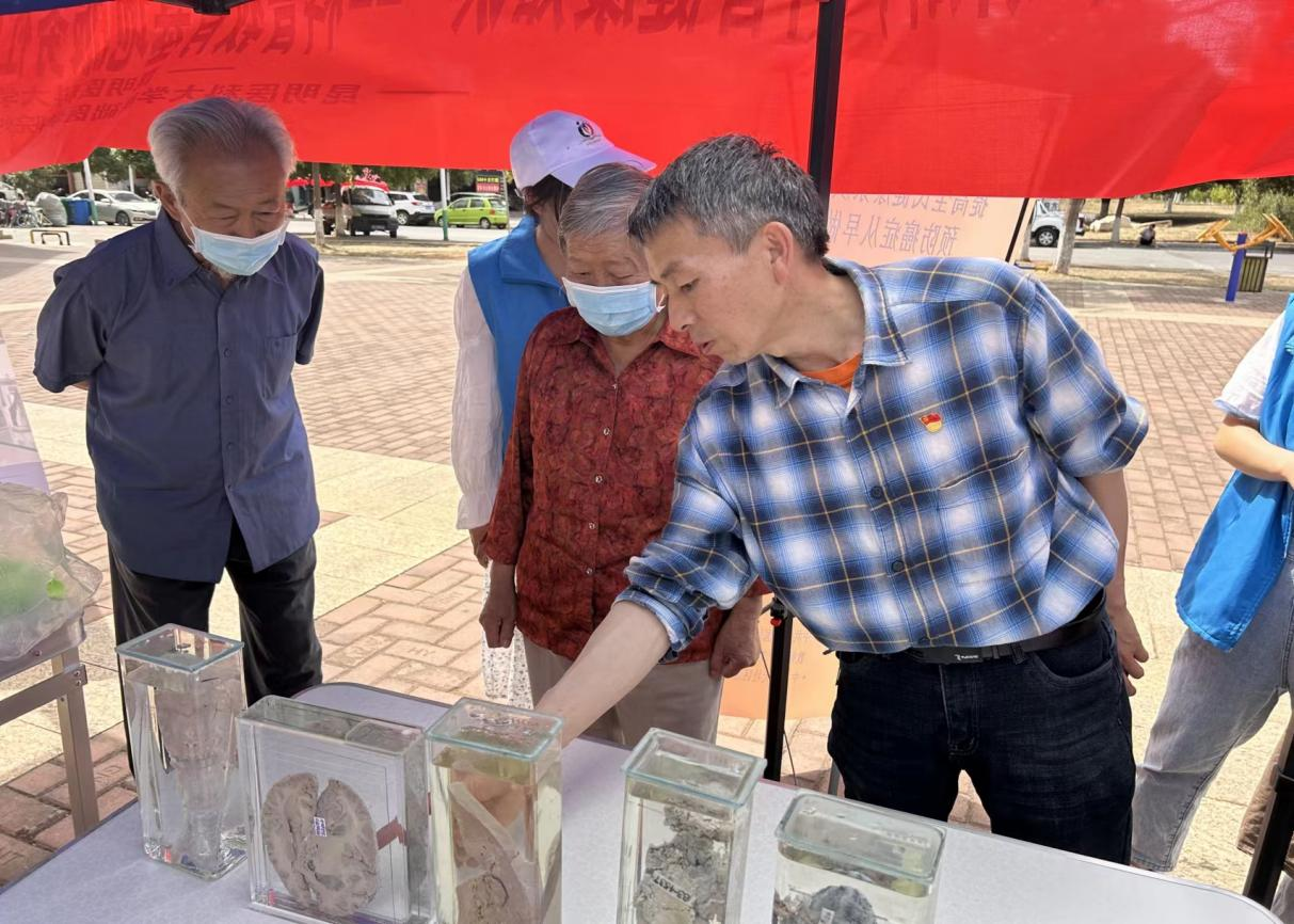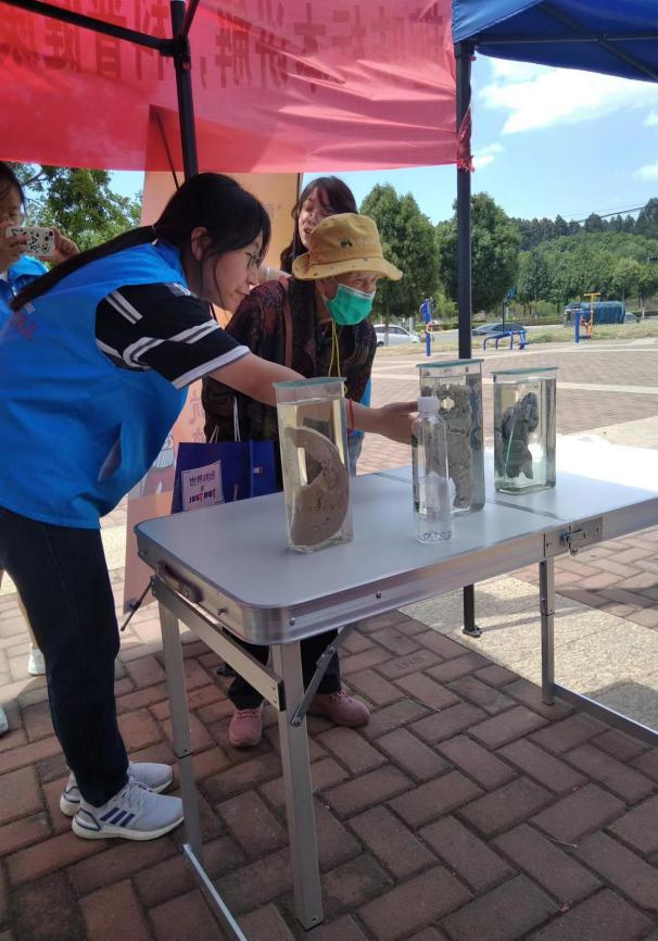 教师第十党支部科普宣传团队带领基础医学院烛雨志愿服务队到天润康园广场撑起雨棚,悬挂标语,支起宣传展板,整齐排放好实物标本,有条不紊做好准备工作。小区居民方法前来观看、咨询。在前期科普基地实验中心教师辅导下,为前来参观宣传的居民详细解答,认真讲解肝癌、肺癌、脑出血等标本,以及相关疾病的预防知识。参观者纷纷表示:宣教展出“办得好”,“希望以后再展出”。