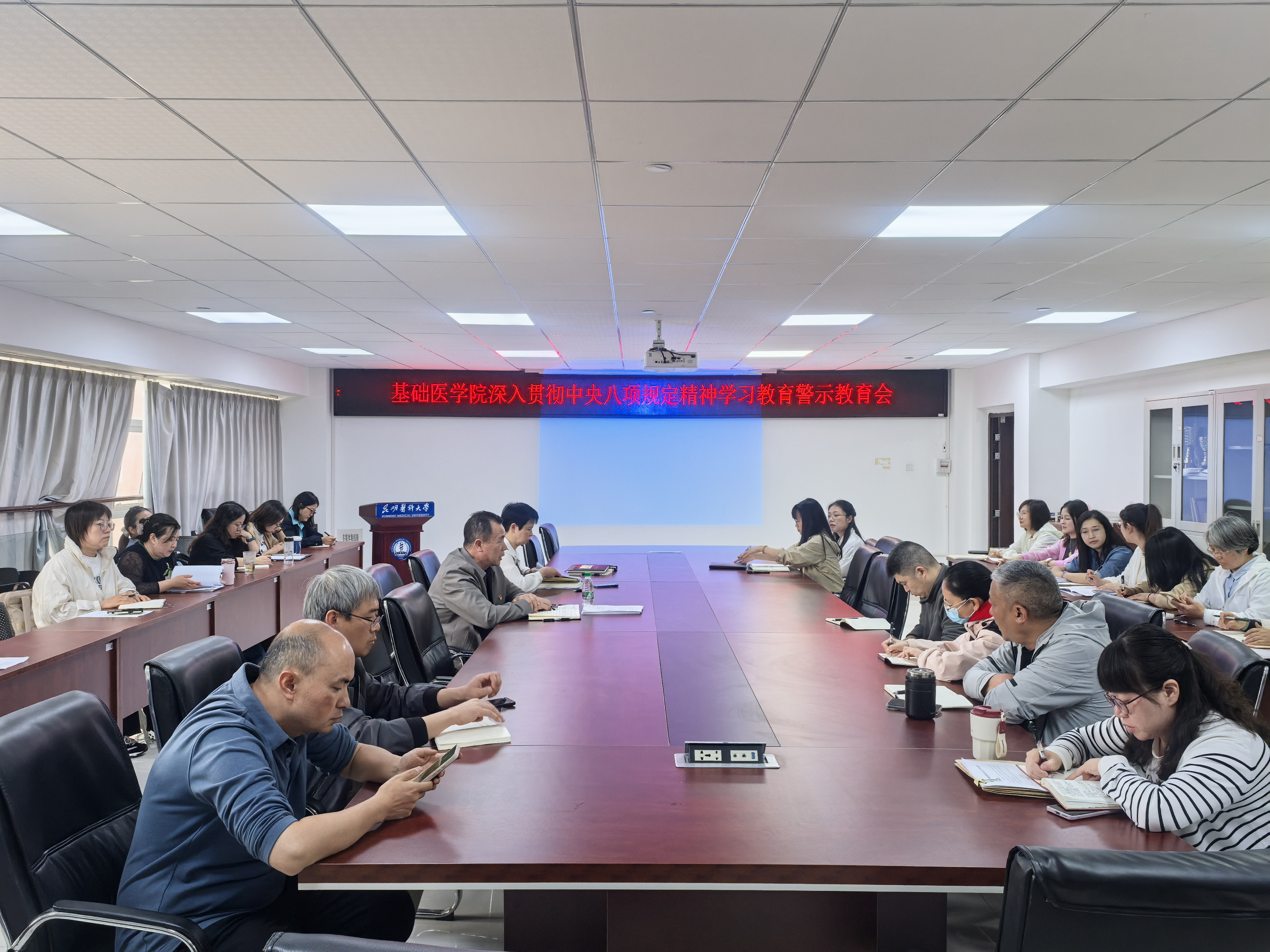 5月15日,beat365中文官方网站基础医学院开展深入贯彻中央八项规定精神学习教育警示教育会在基础医药大楼614会议室召开,深入学习党的十八大以来深入贯彻中央八项规定精神的成效和经验,结合开展深入贯彻中央八项规定精神学习教育,落实上级有关工作部署要求,集中学习纠治党员干部和公职人员违规饮酒问题八个重点方面。