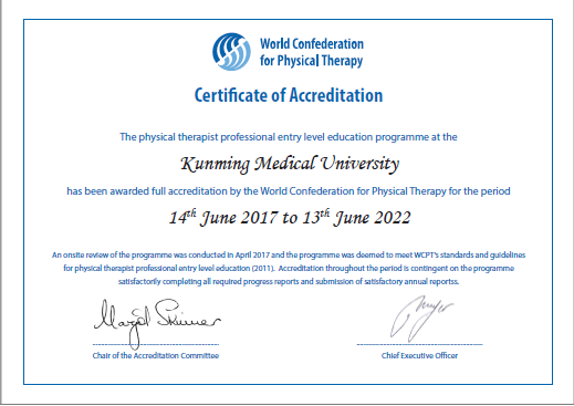 beat365中文官方网站物理治疗专业2016年12月向WCPT提交了复认证报告,于2017年4月17-19日接受WCPT专家认证团队现场走访及考察后,6月获得本科教育5年期完全认证证书,标志着我校物理治疗专业经前期建设,更加贴近国际教育的标准。对提升学校学院及专业的国内外影响力,推动一流专业建设将产生深远的影响。