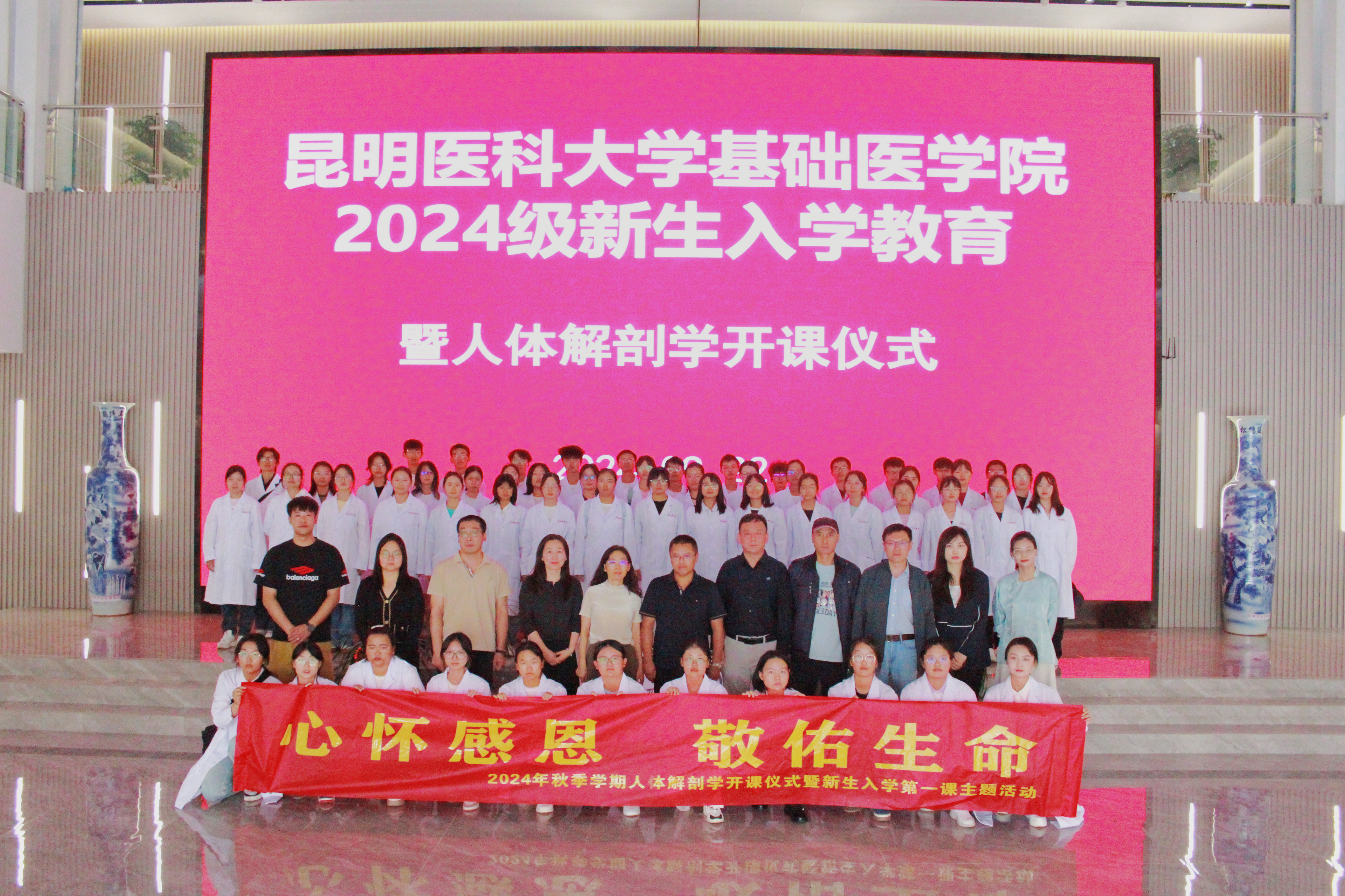 2024年9月22日下午13时,beat365中文官方网站基础医学院2024级新生入学教育暨人体解剖学开课仪式在人体科学馆成功举行。学院副院长杨新旺、学生工作办公室主任杨青青、人体解剖学与组织胚胎学系、人体解剖学实验室教师代表及2024级新生代表出席仪式,仪式由人体解剖学实验室主任于洋主持。