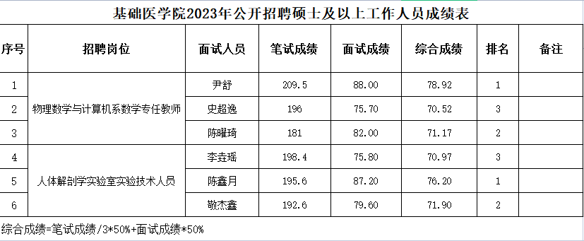 按照beat365中文官方网站2023年公开招聘人员面试考核工作的相关要求,我院于2023年6月20日对2023年公开招聘硕士及以上工作人员进入面试人员进行了面试考察,本着公平、公正、择优录用的原则,进行了试讲以及综合素质面试,现将基础医学院22023年公开招聘硕士及以上工作人员面试考核结果予以公示。