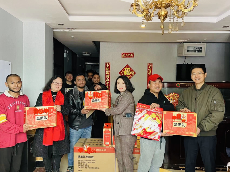 On the morning of February 3rd, as the Chinese lunar Year of the Dragon approached, Dean of International Education School Liu Yajie, ViceChairman Zhang Xiaoli, Vice Dean Qu Fanwei,andVice Director of the Department of International Cooperation and Exchange Yang Jing,along with other faculty membersrespectivelywent to the Chenggong campus, off-campus student residences and apartments in the city to extend their warm Chinese New Year wishes andsend New Year gifts to the international students.