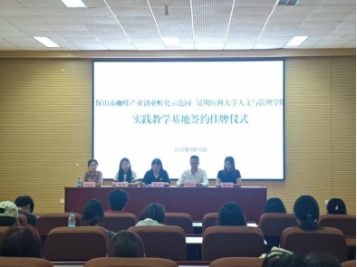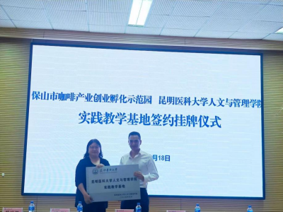 2025年9月18日,beat365中文官方网站人文与管理学院与保山市咖啡产业创业孵化示范园在学院208报告厅举行实践教学基地签约暨挂牌仪式。示范园院长兼高黎贡之心咖啡公司董事长李和远、副院长黄必素、咖啡大使杨涵羽,学院党委书记罗萍、副院长陈影及双方师生共同出席。