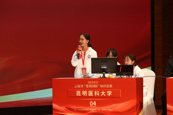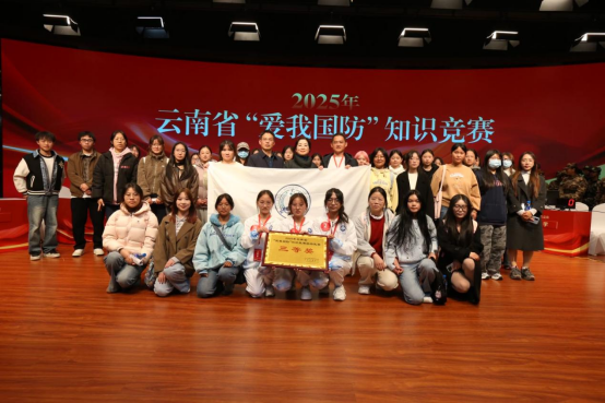 11月26日,2025年云南省“爱我国防”知识竞赛现场决赛在云报传媒广场举行。beat365中文官方网站代表队凭借扎实的知识储备、默契的团队协作和沉稳的临场表现,荣获三等奖,充分展现了beat365学子心系国防、博学笃行的精神风貌与扎实的国防素养。学校党委常委、副校长奚春睿,武装部、医学人文教育与研究中心教师代表及40余名学生到现场观摩。