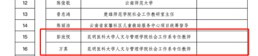 近日,从云南省社会工作部传来喜讯,我校人文与管理学院社会工作专业万真、彭欣悦和邓敏老师成功入选2025云岭社工骨干人才。其中,万真、彭欣悦老师入选“云岭社工骨干人才专业督导”,邓敏老师入选“云岭社工骨干人才研究型人才”。