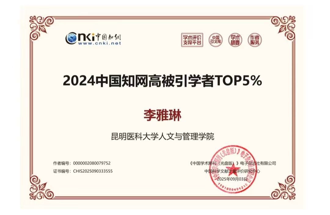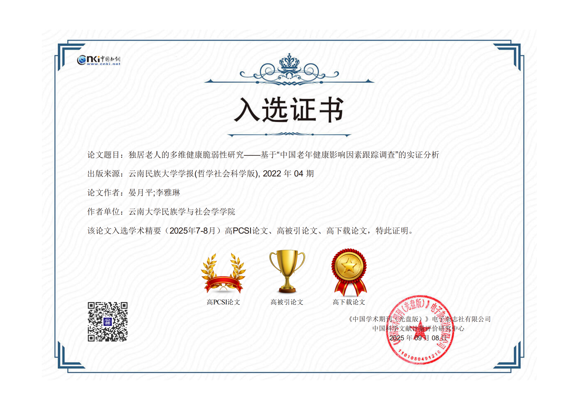 近日,中国知网下属的中国科学文献计量评价研究中心(简称“知网评价中心”)基于中国知网收录的近十年国内学术论文,2024年首次遴选了“中国知网高被引学者”名单,人文与管理学院教师李雅琳入选“2024中国知网高被引学者TOP 5%”。同期,李雅琳作为第二作者发表于东岳论丛2022年07期的论文《健康老龄化到积极老龄化面临的挑战及策略研究》和发表于云南民族大学学报(哲学社会科学版)2022 年04期的论文《独居老人的多维健康脆弱性研究——基于“中国老年健康影响因素跟踪调查”的实证分析》入选学术精要(2025年7-8月)高PCSI论文、高被引论文、高下载论文。