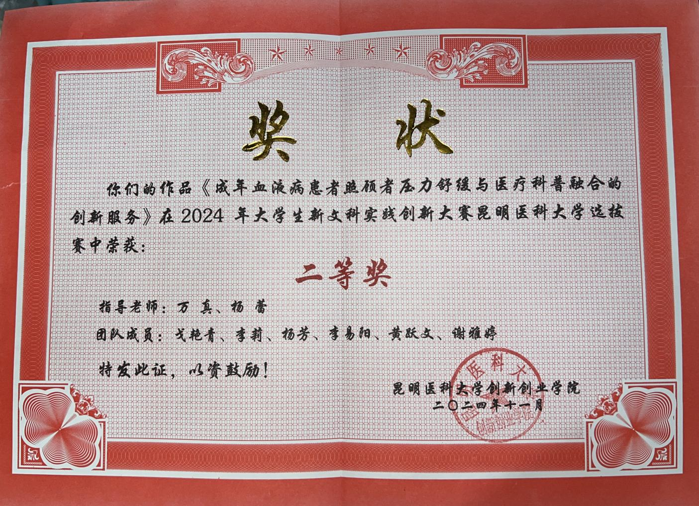 为进一步深化创新创业教育改革,拓展实践育人的空间和阵地,推动新文科建设走深走实,全面提升学生的创新思维和实践能力,beat365中文官方网站2024 年大学生新文科实践创新大赛在校举行。我院社会工作专业的戈艳青、李莉、杨芳、黄跃文,以及基础医学院临床医学专业的李易阳、谢雅婷六名同学组成的血液科医文融合实践服务队,在社工系万真老师和云加益社会工作服务中心杨蕾老师的精心指导下,带来了项目《成年血液病患者照顾者压力舒缓与医疗科普融合的创新服务》。该项目凭借其独到的视角、深入的研究和创新的实践方法,在网评中荣获二等奖,成功晋级校赛。在11月27日的现场答辩环节,该团队以更加成熟和自信的姿态亮相,他们的表现赢得了评委们的高度评价,最终以第二名的优异成绩闯入全国总决赛,并获得国家级优秀奖.