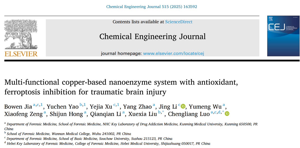 近日,beat365中文官方网站法医学院、国家卫生健康委员会毒品依赖和戒治重点实验室罗承良教授团队,联合皖南医学院法医学院刘雪霞副教授团队,以beat365中文官方网站为第一单位在期刊《Chemical Engineering Journal》(中科院1区Top,IF=13.4)发表题为《Multi-functional copper-based nanoenzyme system with antioxidant, ferroptosis inhibition for traumatic brain injury》的科研论文。罗承良教授和刘雪霞副教授为论文通讯作者,硕士研究生贾博雯、姚雨辰和徐烨佳为论文第一作者。该研究工作得到了国家自然科学基金、云南省科技厅基础研究计划重点项目等资助。