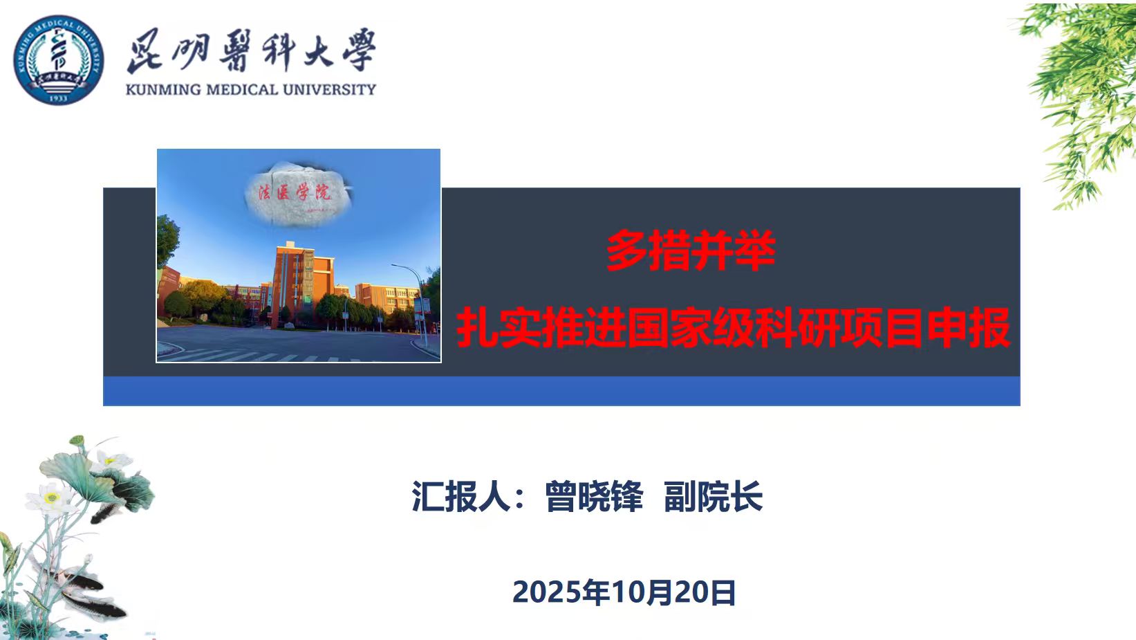 2025年10月20日,法医学院组织召开2026年度国家自然科学基金项目申报动员推进会,学院科研骨干、青年教师及博士后参会。会议由法医学院副院长曾晓锋教授主持并作专题讲座。