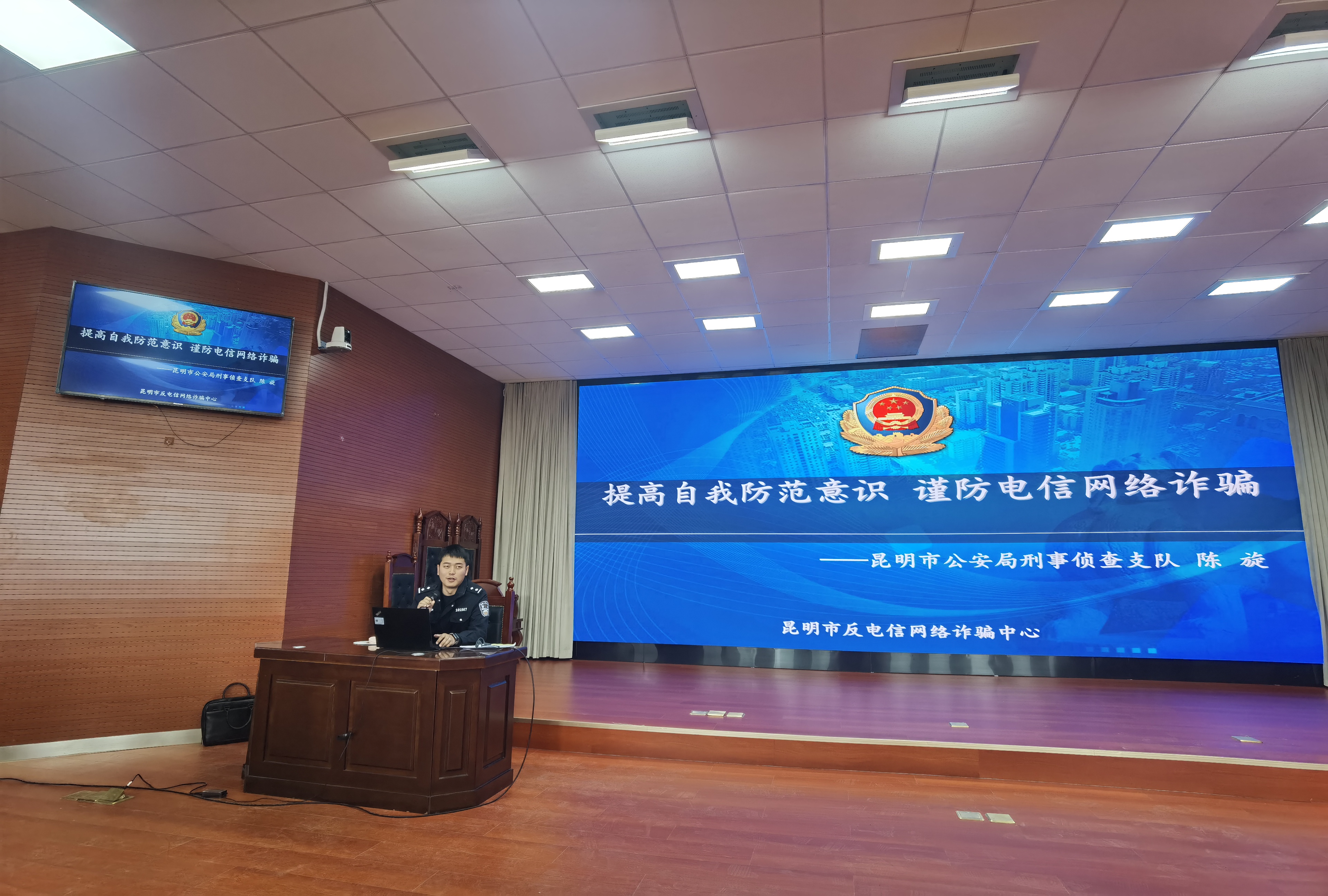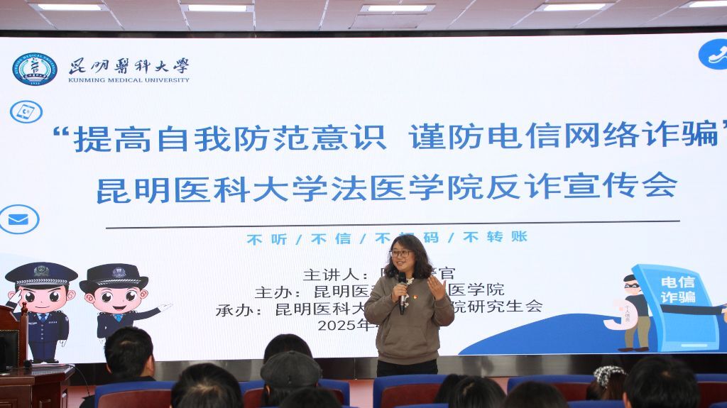 2025年4月11日法医学院研究生党支部与昆明市公安局刑侦支队开展共建活动,在法医楼模拟法庭举办防范电信诈骗普法宣传主题教育,新型犯罪侦查大队陈旋警官、李冰楠警官受邀开展“提高自我防范意识 谨防电信网络诈骗”的主题讲座。