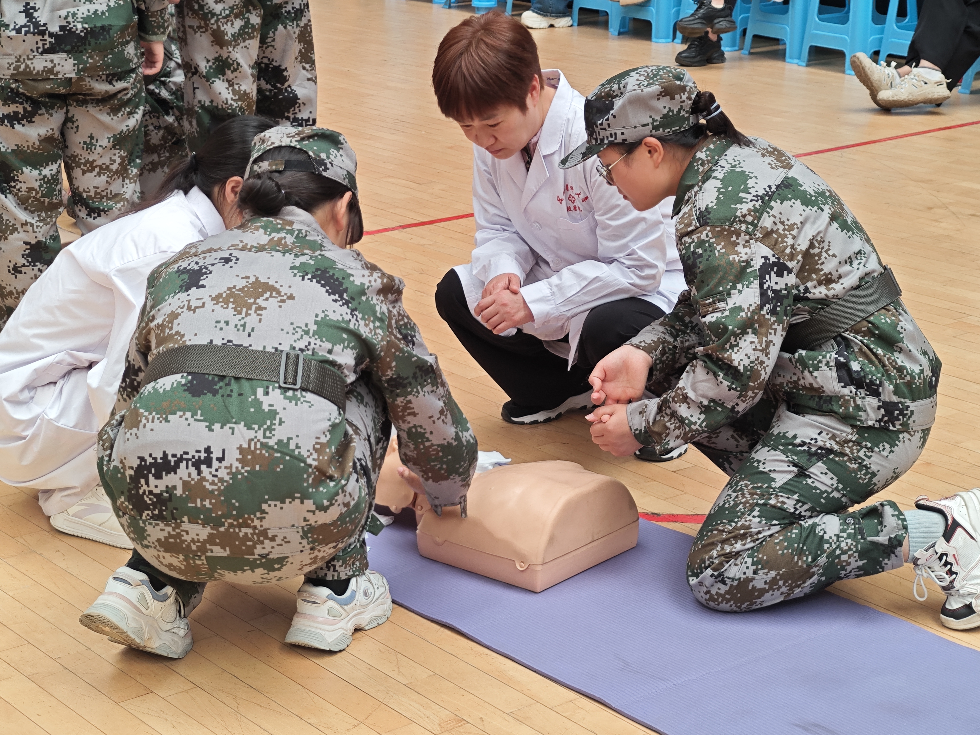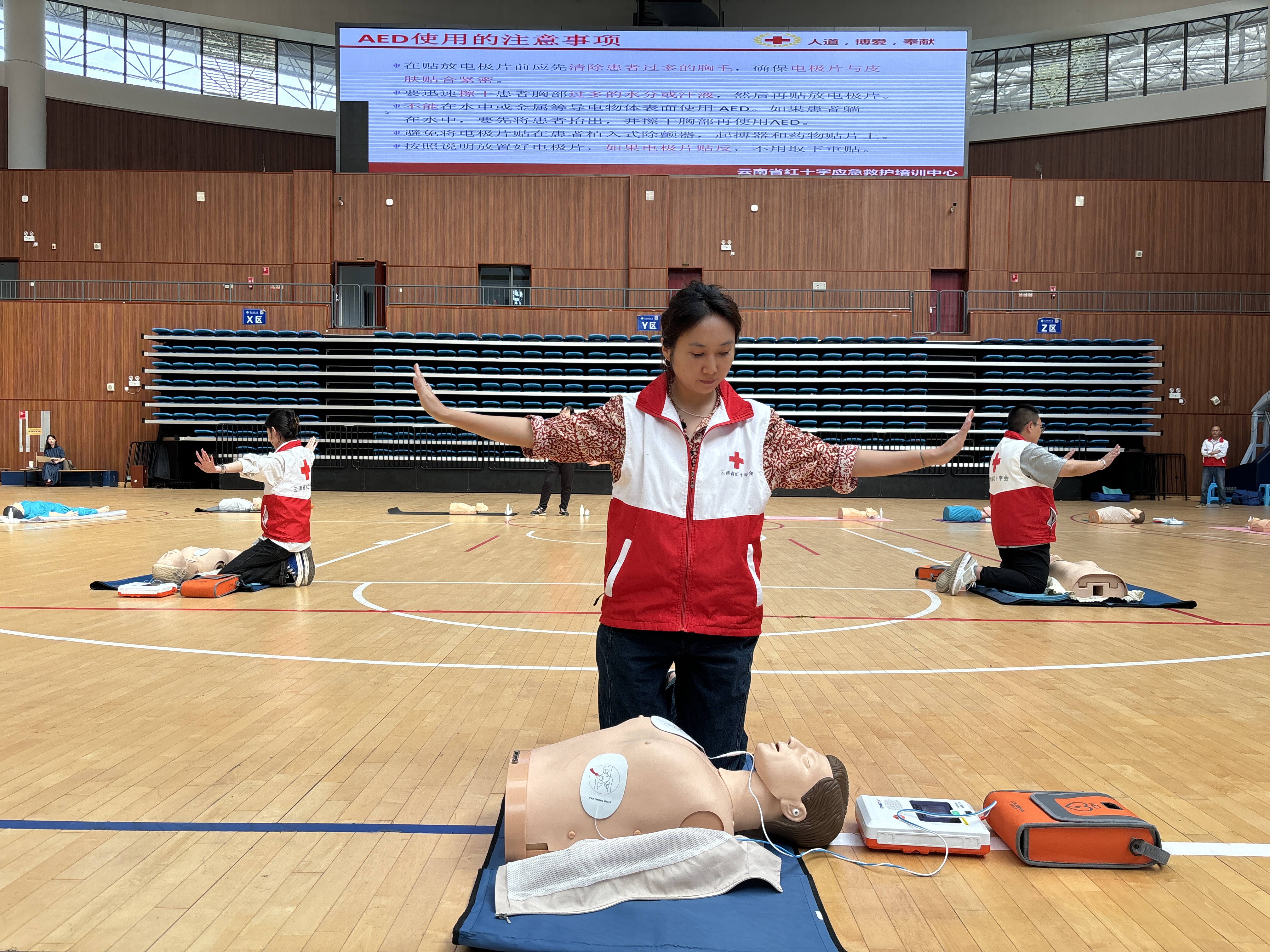 本次培训以理论讲解和实践操作相结合的方式展开。云南省红十字应急救护培训中心吕冬菊老师结合实地救护案例,深入浅出地对救护概论、防灾减灾避险逃生、气道异物梗塞及心肺复苏、自动体外除颤器(AED)等相关知识进行讲解。通过真实的案例分析和实际操作演示,让同学们深刻认识到“学急救,保平安”的重要性,激发了他们学习急救知识的热情。校医院医护人员、第一临床学院志愿者及省红十字会培训人员指导学生进行海姆立克急救法、心肺复苏及AED使用现场实践操作。
