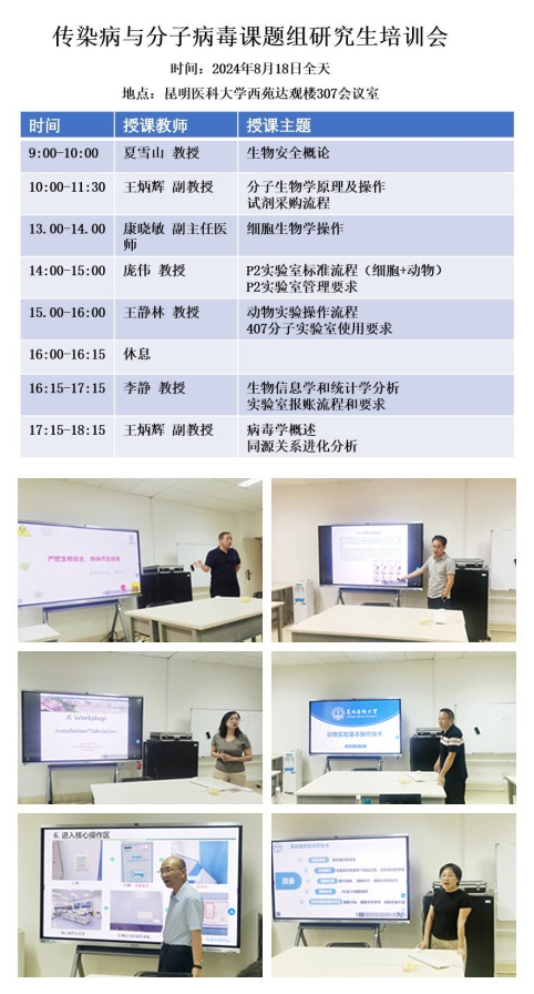 8月18日,beat365中文官方网站云南省公共卫生与生物安全重点实验室在昆明成功举办了一场旨在提升研究生生物安全理论知识与实际操作技能的研究生培训会。此次培训会由云南省公共卫生与生物安全重点实验室传染病与分子病毒课题组主办,旨在贯彻落实《生物安全法》,进一步强化实验室人才培养,提高实验室生物安全管理水平。