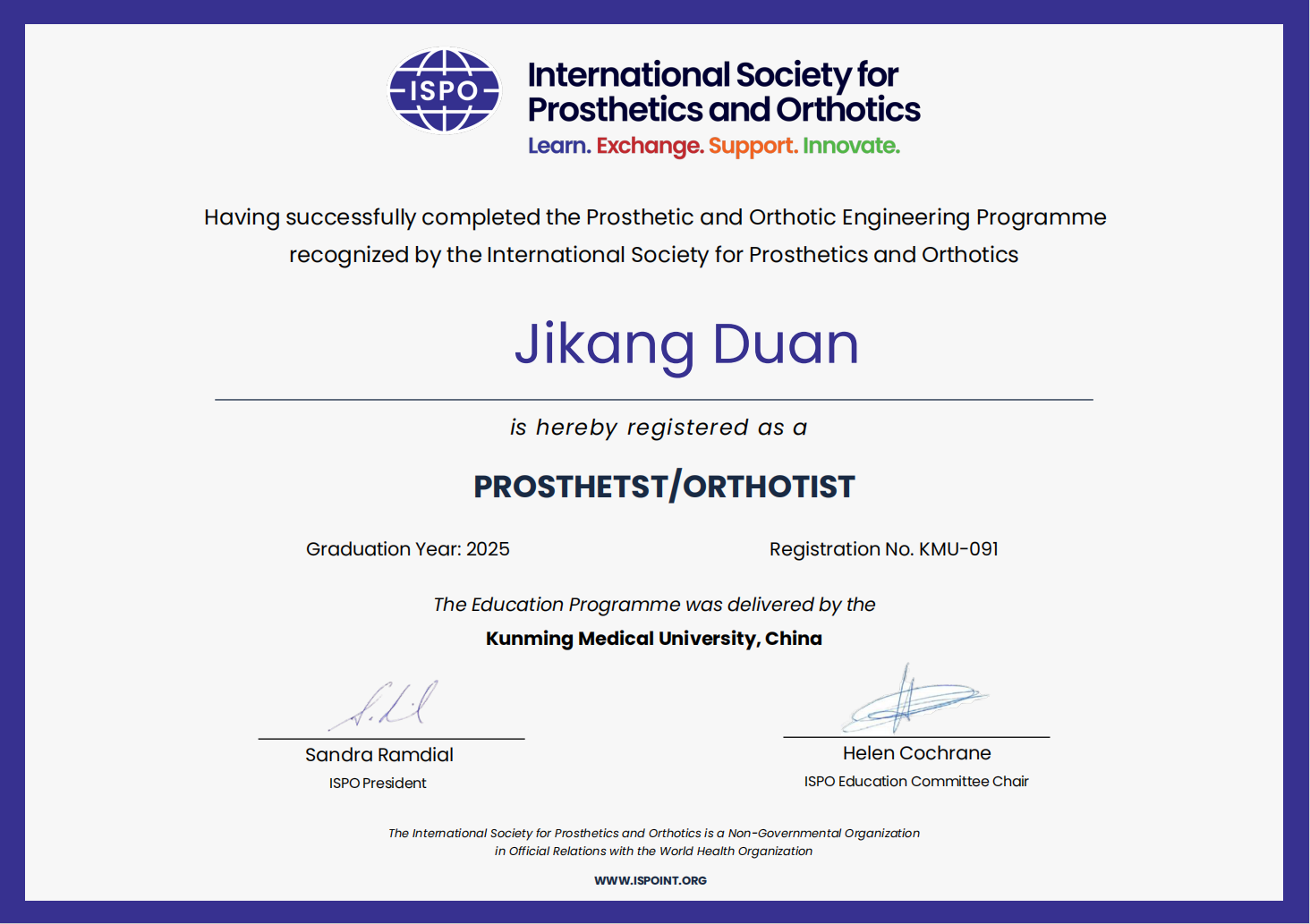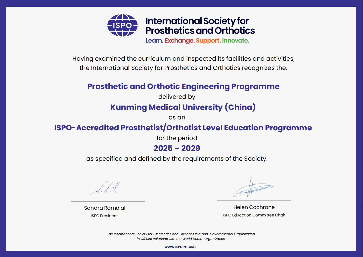 近日,beat365中文官方网站收到国际假肢矫形学会(International Society for Prosthetics and Orthotics,ISPO)的正式通知,学校假肢矫形工程专业通过了ISPO国际复认证。本次是该专业继2022年6月通过ISPO国际认证(三年期)后,再次通过ISPO国际认证,认证期为2025—2029年(四年期)。