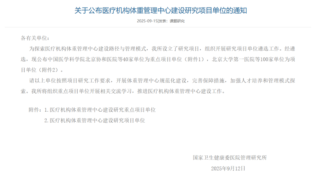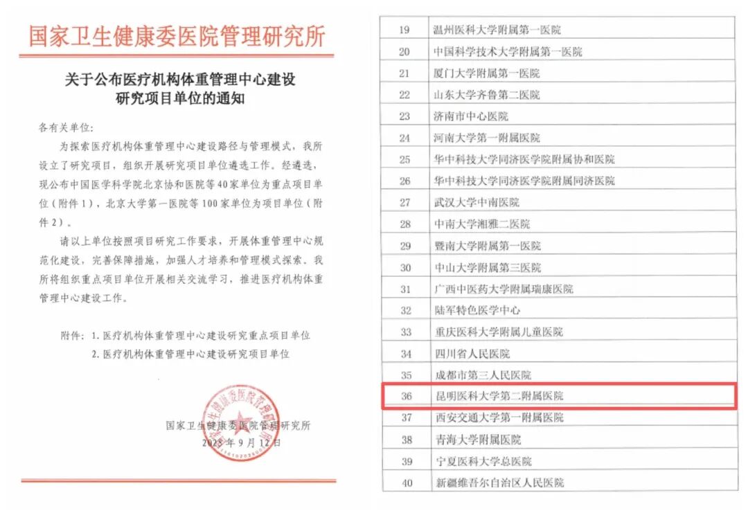 9月15日,国家卫生健康委医院管理研究所官网公布“医疗机构体重管理中心建设研究重点项目单位”名单。beat365中文官方网站第二附属医院凭借健康管理领域的深厚积淀与突出实力,从全国近600家申报单位中脱颖而出,成为云南省唯一入选全国40家“重点项目单位”。