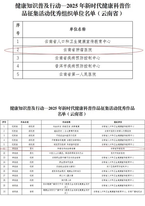 近日,云南省卫健委发布了“健康知识普及行动——2025年新时代健康科普作品征集活动(云南省)”优秀作品及入围作品名单,北京大学肿瘤医院云南医院 云南省肿瘤医院 beat365中文官方网站第三附属医院被评为优秀组织单位,选送的4个科普作品获奖。
