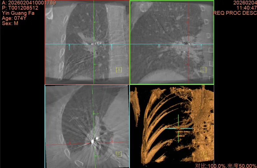 患者尹某,8年前因左肺上叶腺癌在外院行外科手术切除,术后7个月发现右肺下叶背段结节,定期进行复查。2026年2月来院复查时,发现右肺结节较之前不断增大,恶性可能性大,淋巴结增大建议复查。收治患者后,胸外一科黄云超教授带领团队依据检查结果,开展多学科会诊。其间,专家团队结合患者既往肺切除史、慢性肺阻塞(COPD)、心肺功能较差等情况,认为再行外科手术风险较高。同时考虑到结节为中央型结节,边缘有血管伴行,经皮穿刺风险较大,而经气管镜在导航引导下建立隧道可巧妙避开血管安全抵达结节,决定先行经电子超声支气管镜针吸活检术(EBUS-TBNA),排除淋巴结转移以后再行支气管镜下经肺实质建立隧道肺结节活检及消融术。