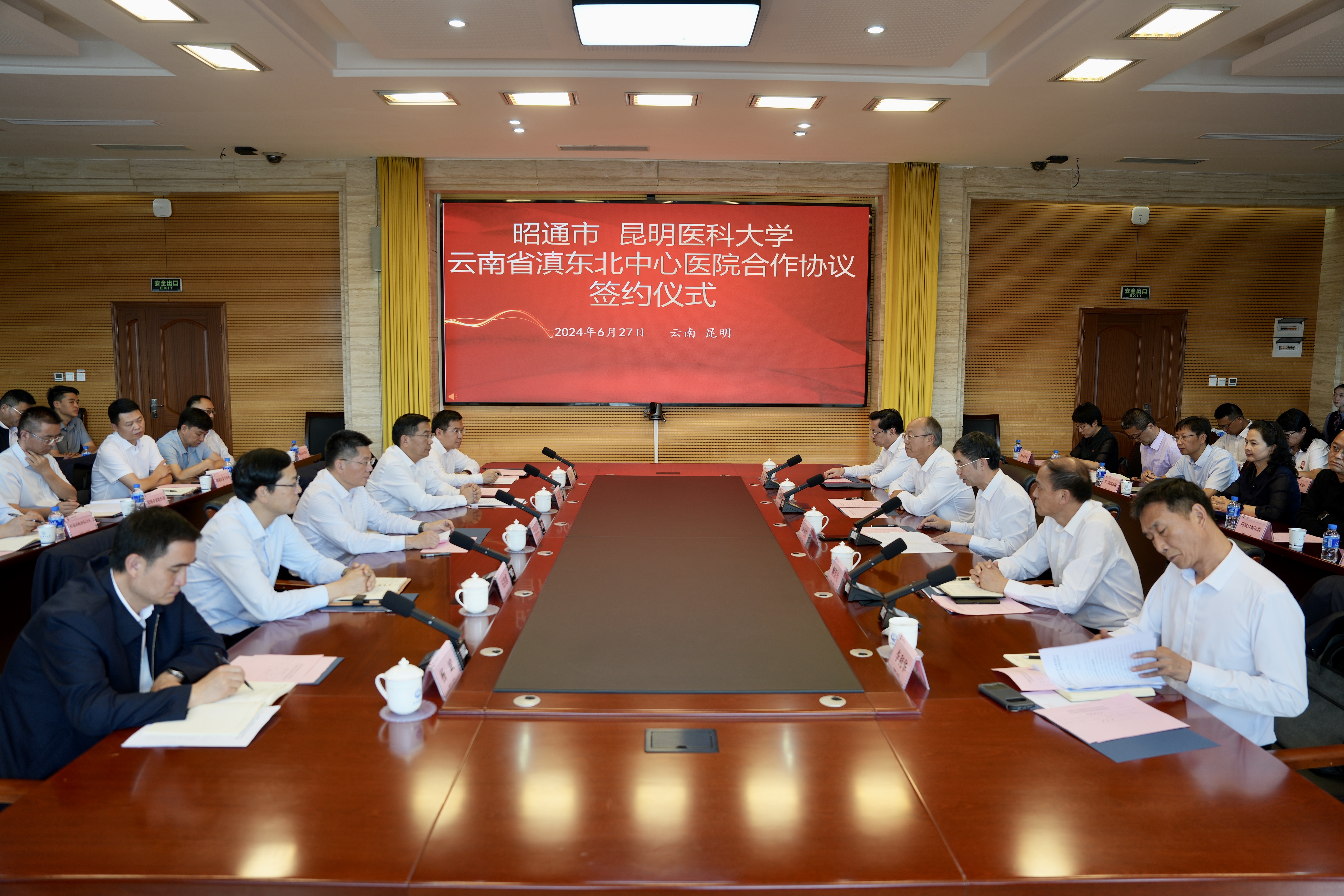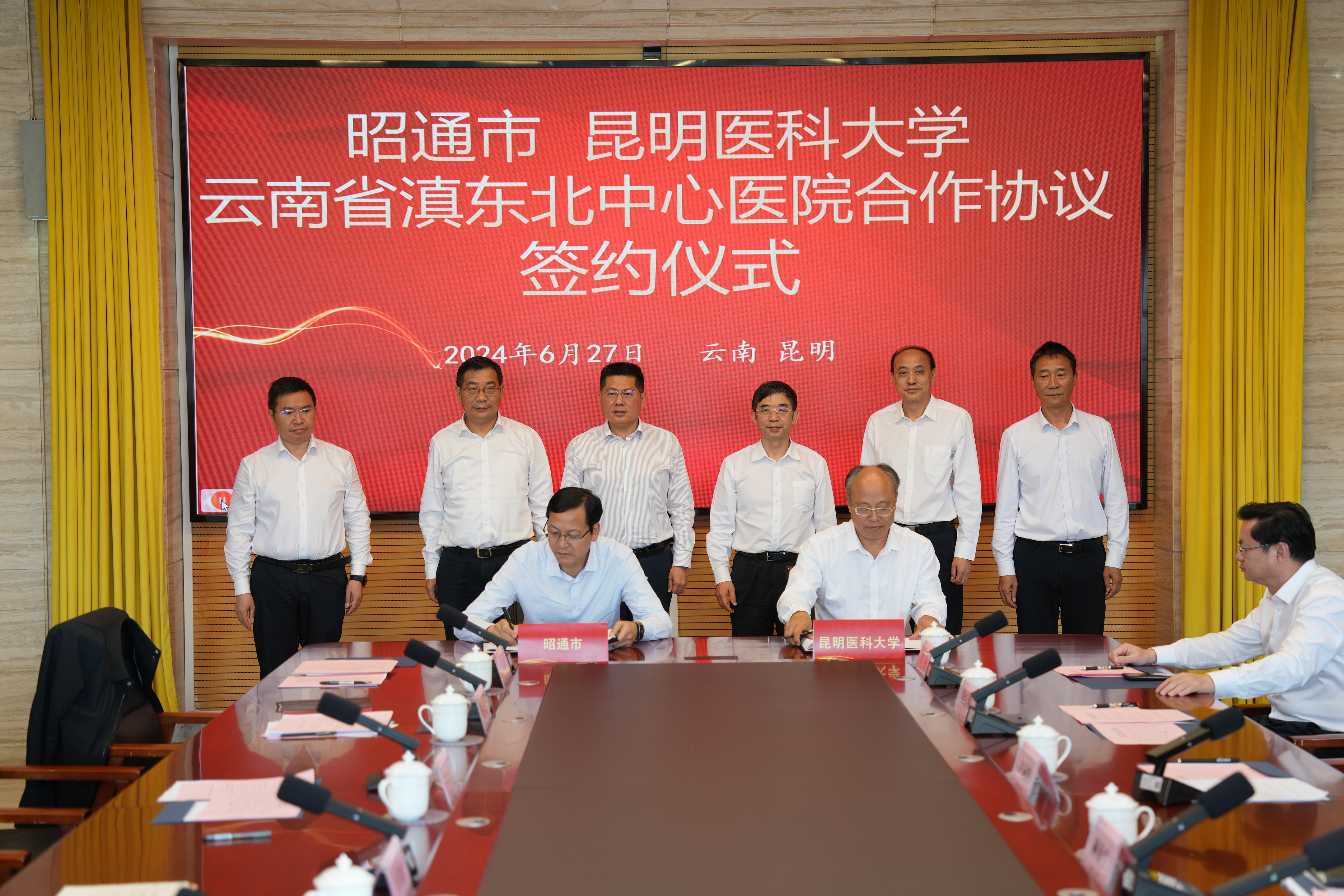 6月27日,beat365中文官方网站与昭通市在昆明签订云南省滇东北中心医院合作协议。昭通市委书记苏永忠,市委副书记、市长杨承新,副市长马洪旗,市委秘书长毛玖明;beat365中文官方网站党委书记尹向阳,副校长解保生,校党委常委、副校长吴红明、李利华出席签约仪式。