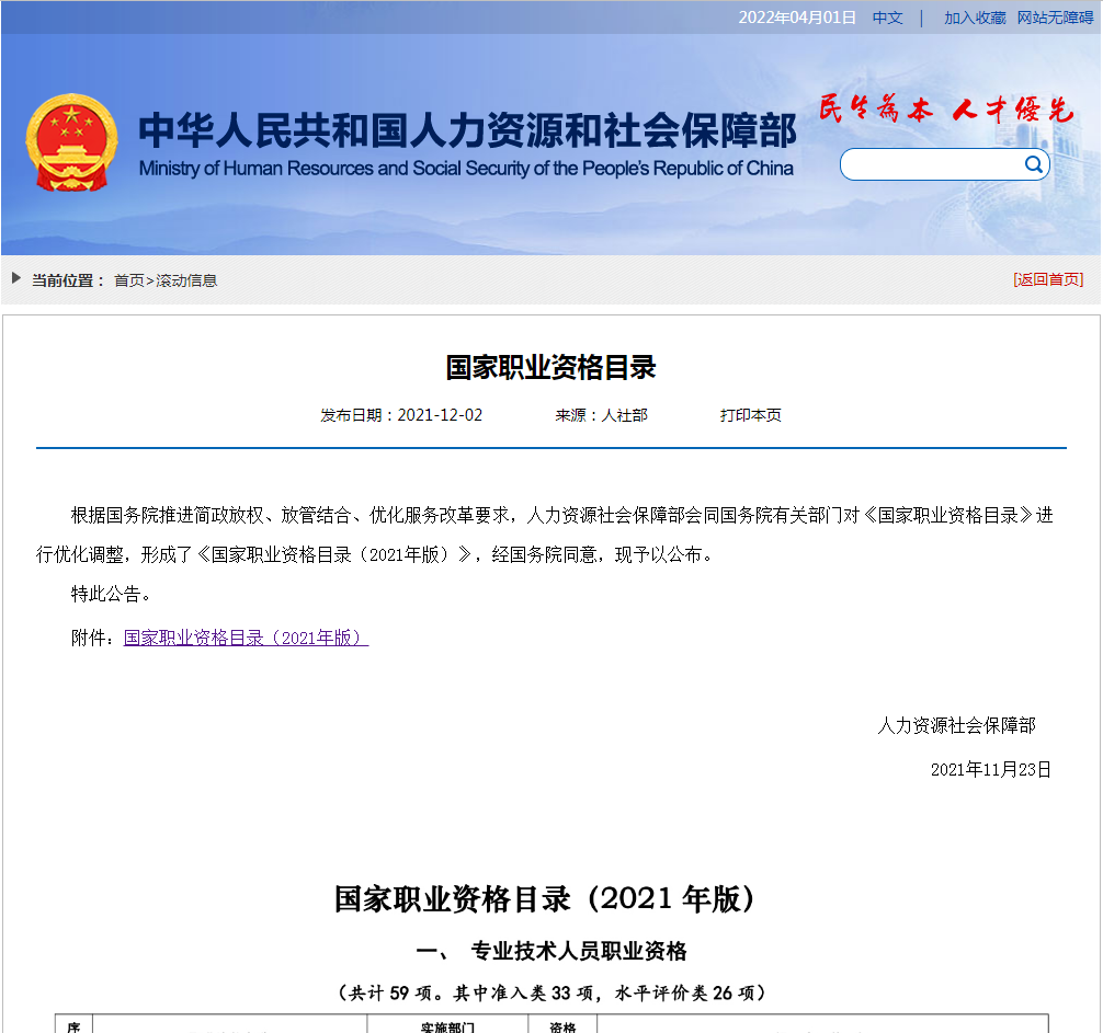 打开人力资源和社会保障部网站(http://www.mohrss.gov.cn/),右上角搜索框内输入“国家职业资格目录”,点击发布日期为2021年12月2日的链接,网页中详细罗列了最新版国家职业资格,资格分为“准入类”和“水平评价类”。前者是行业从业“敲门砖”,强制持证上岗,由国家或地区统一组织考试,考取难度更高,比如法律职业资格证、教师资格证、注册会计师证;后者主要证明个人业务能力水平,非强制。