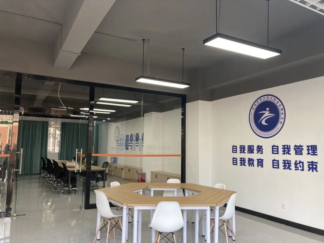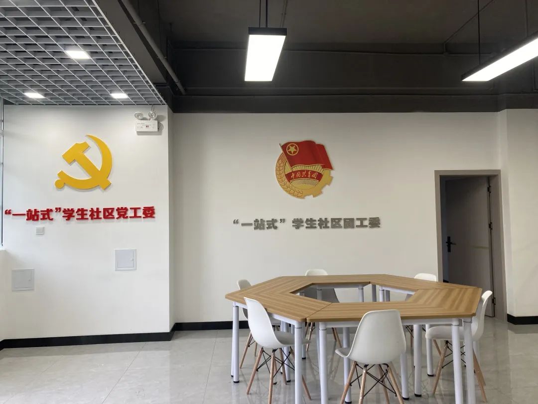 是“一站式”学生社区社区党工委、社区管理委员会、社区团工委、大学生自律委员会中心办公、活动开展区域,区域内可容纳50人同时进行各种活动开展。