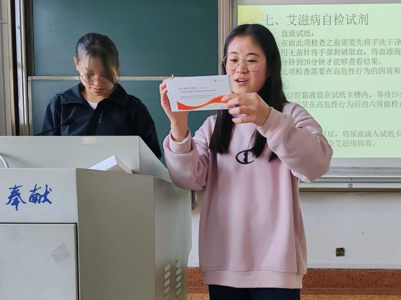 小青红们让同学们撕下了歧视艾滋病的标签,讲解了如何使用正确使用避孕套,演示了唾检包和尿检包的使用方法,并介绍了艾滋病阻断药PrEP、PEP的服用剂量。这两次同伴教育优秀小组宣讲活动,以多种形式开展,聚焦于防艾主题,两次活动干预总人数高达百名,且活动参与率达到100%。