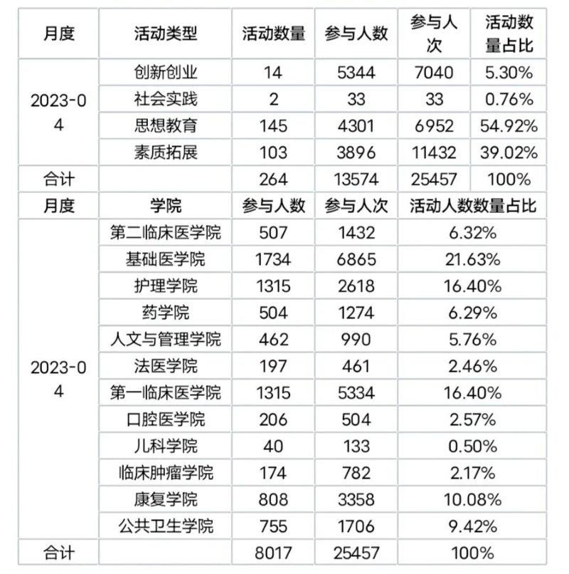 截止2023年4月30日中午12:00,“第二课堂”平台共开展活动264项,参与人数13574人,参与人次25457次。