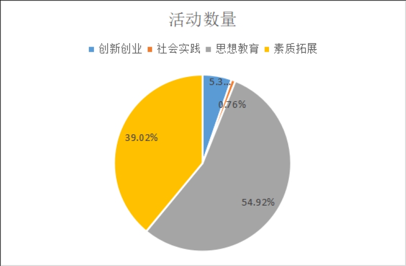 活动类型包括创新创业、社会实践、思想教育、素质拓展。创新创业类活动开展14项,社会实践类活动开展2项,思想教育类活动开展145项,素质拓展类活动开展103项。